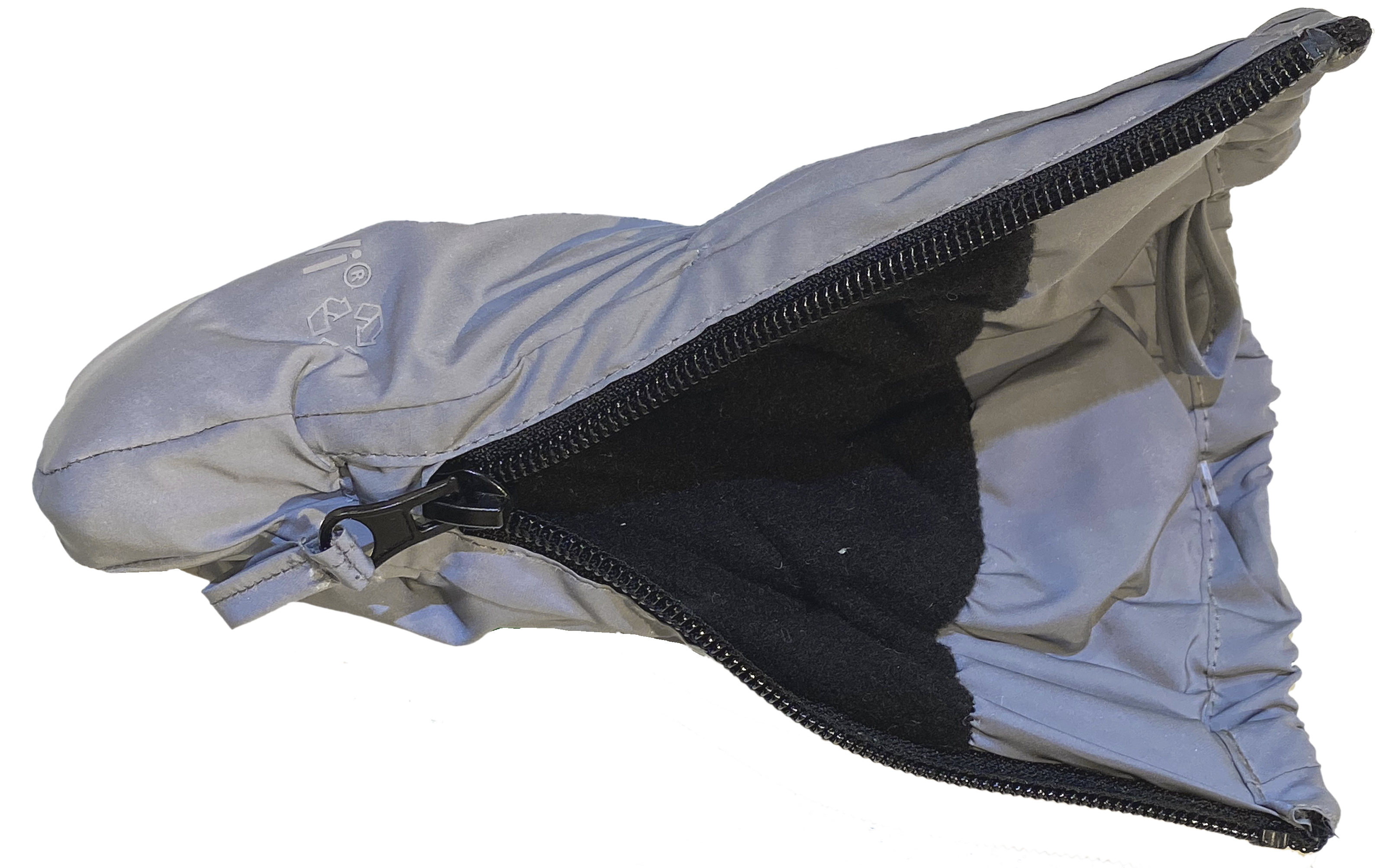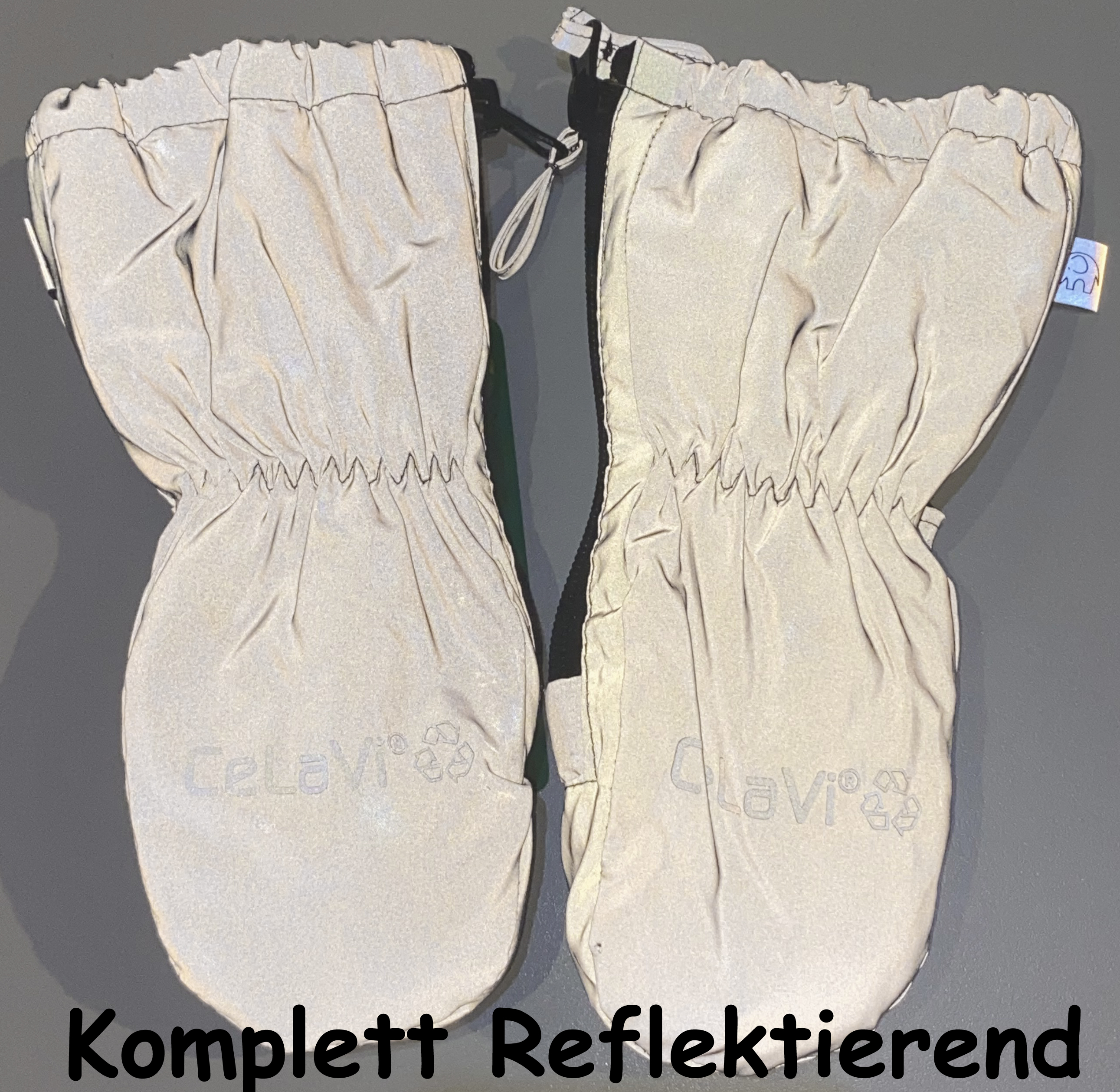 Praktische Fäustlinge aus wasserdichtem, atmungsaktivem Material, innen mit einem weichen Fleece gefüttert und einem seitlichen Zipper zu öffnen, in einem hellen Grau – ein spezielles, komplett reflektierendes Material für eine optimale Sichtbarkeit sobald Licht auf die Handschuhe fällt von dem dänäschen Label CeLaVi.