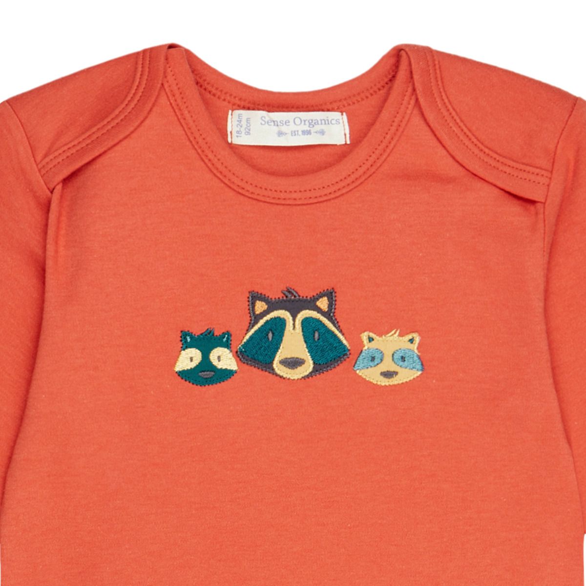 Anliegend geschnittenes Langarmshirt aus weicher Interlock Ware in einem kräftigen Rost Orange Ton mit süßen Waschbären Köpfen bestickt, aus reiner Bio Baumwolle mit GOTS Zertifizierung von Sense Organics.