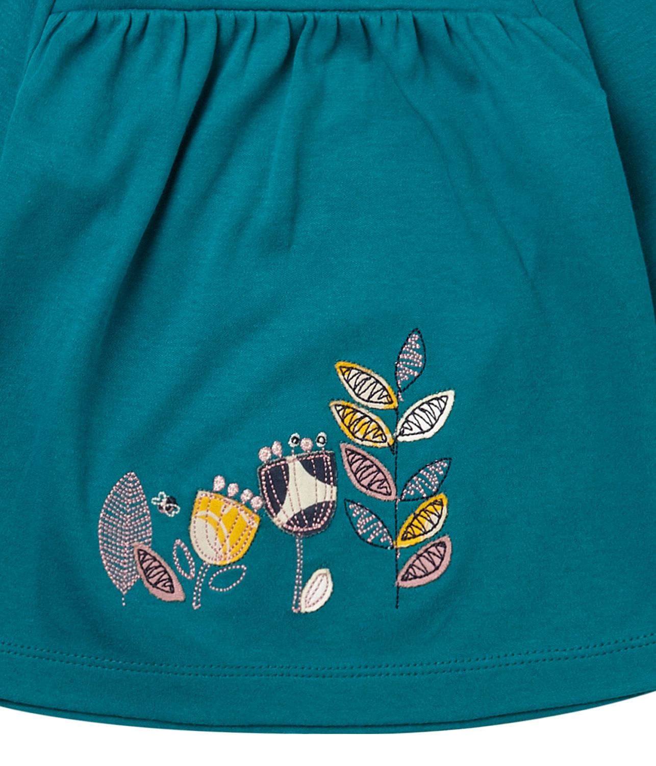 Langarmshirt in ausgestelllter Tunika Form mit rundem Ausschnitt und zauberhafter Stickerei & Applikation auf der Front, in einem kräftigen Petrol Grün Ton, aus GOTS zertifizierter Bio BW für kleine Mädchen von Sense Organics.