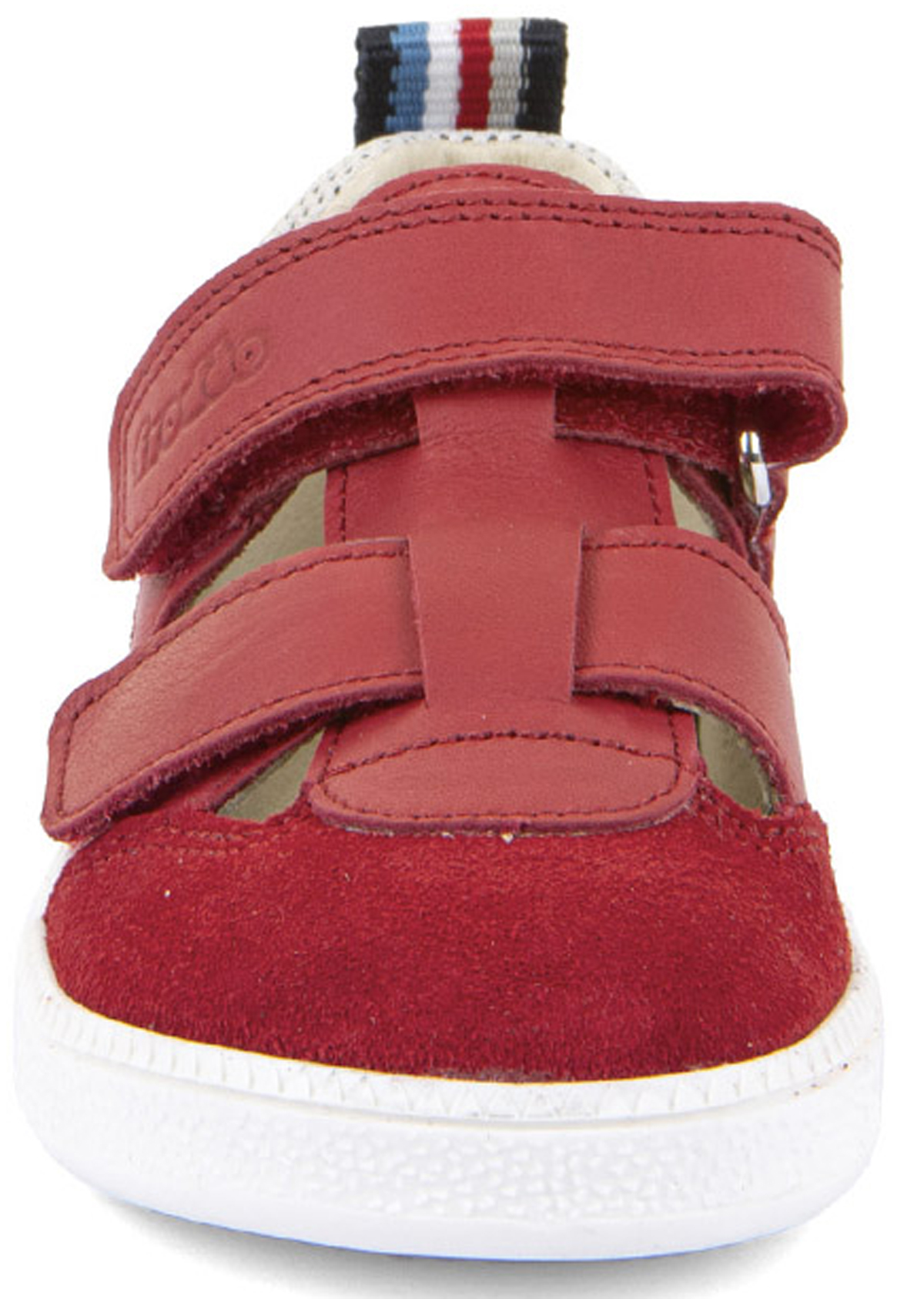 Luftige Halbsandale mit Schutz für die Ferse und die Zehen, seitlich teils geschlossen für optimalem Halt zum klettern und toben, aus weichem Leder mit quer und längs flexibler Minimalsohle / Shoft Sohle Non Marking, in Low Top Höhe mit Doppelklett super anzupassen von FRODDO, hergestellt in Kroatien.