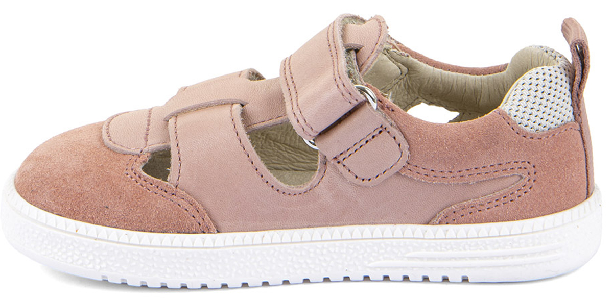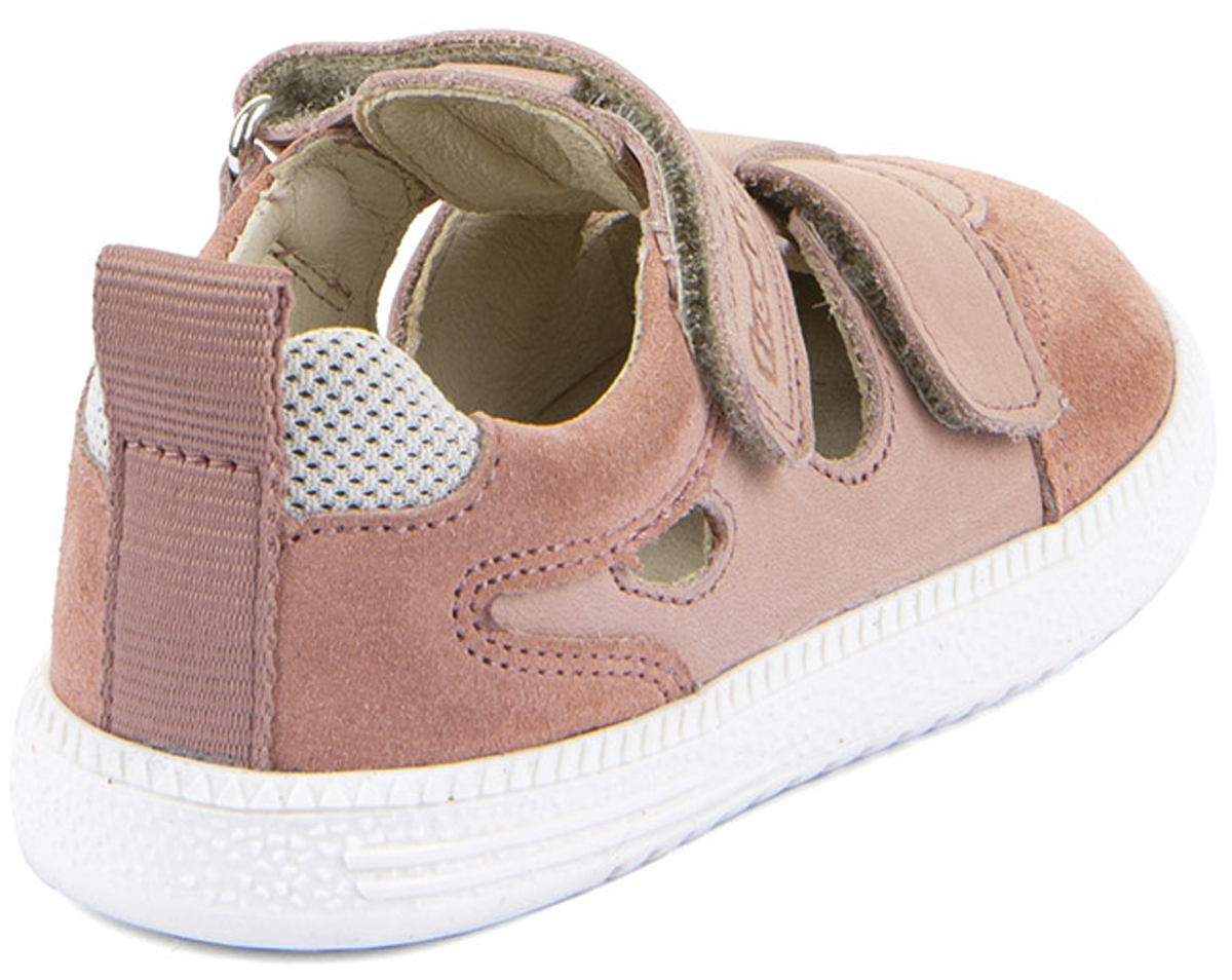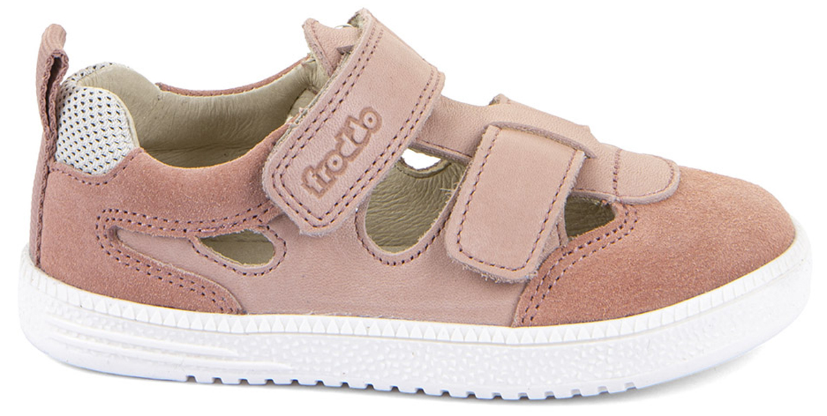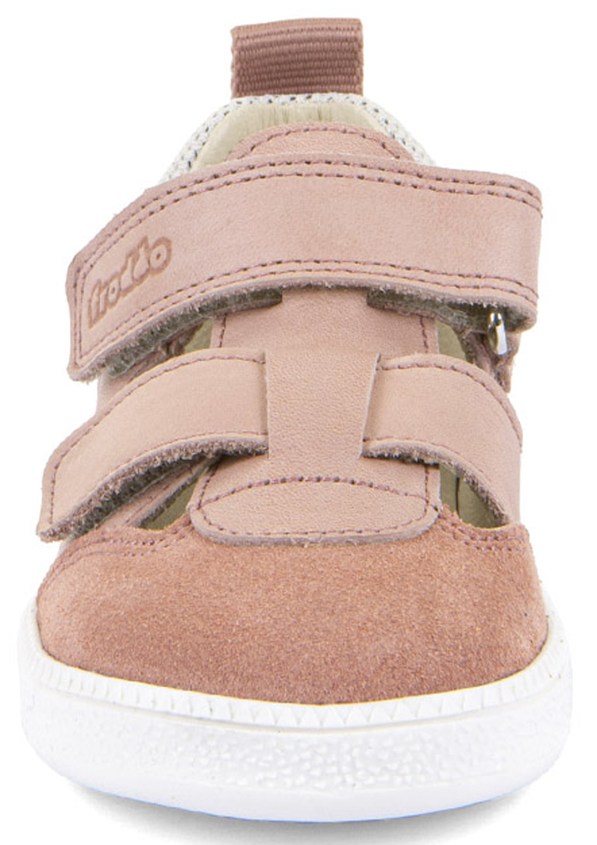 Luftige Halbsandale mit Schutz für die Ferse und die Zehen, seitlich teils geschlossen für optimalem Halt zum klettern und toben, aus weichem Leder mit quer und längs flexibler Minimalsohle / Shoft Sohle Non Marking, in Low Top Höhe mit Doppelklett super anzupassen von FRODDO, hergestellt in Kroatien.