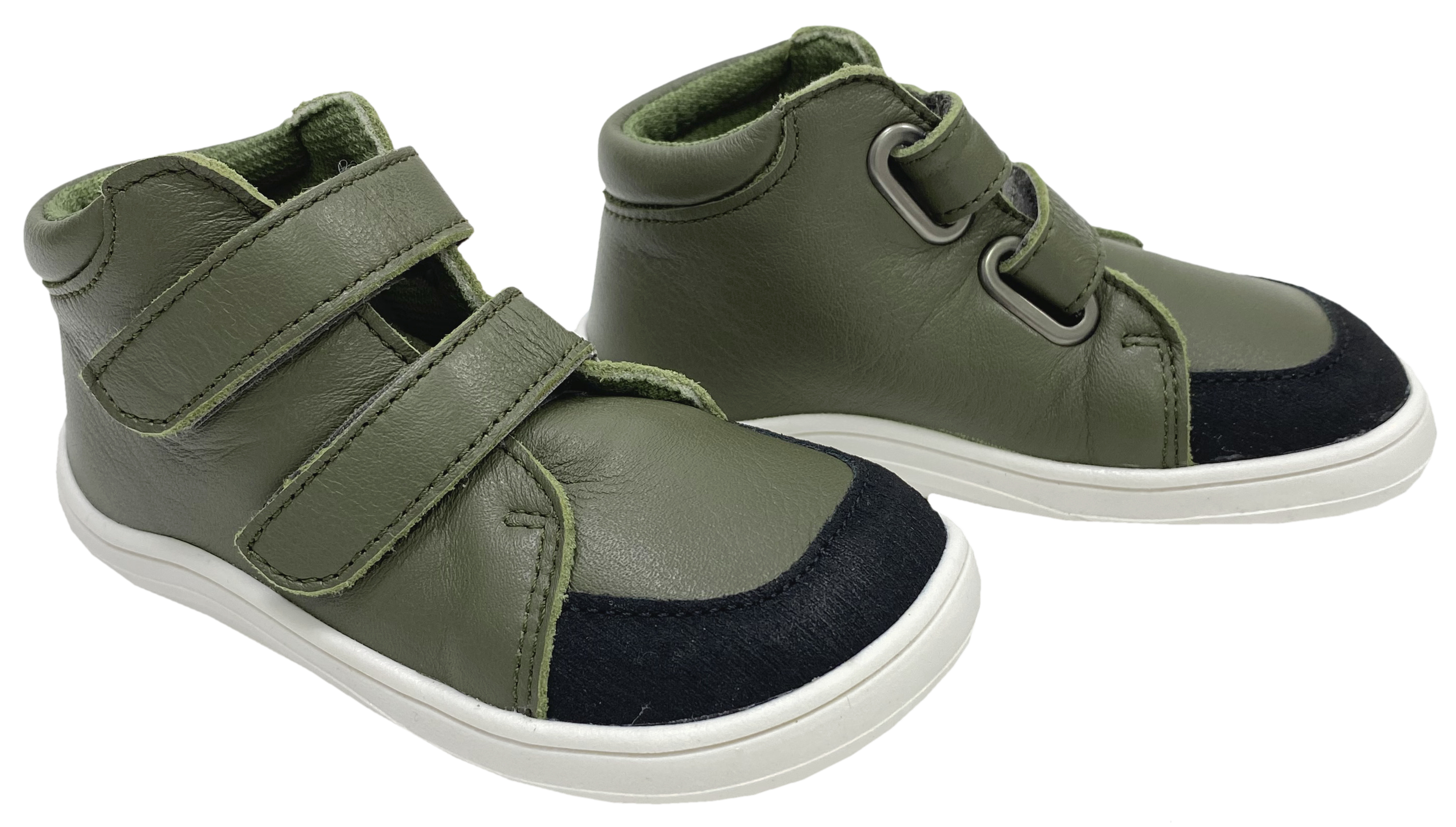 Super bequeme Halbschuhe in Mid Top Höhe aus weichem italienischem Leder mit TEX Membran und weichem, dünnem textilen Futter für den Übergang, mit Doppelklett zu schließen, aus der Zentralslowakai von BABY BARE - ein kleiner Produzent von Barfußschuhen mit Minimalsohlen für Kinder.