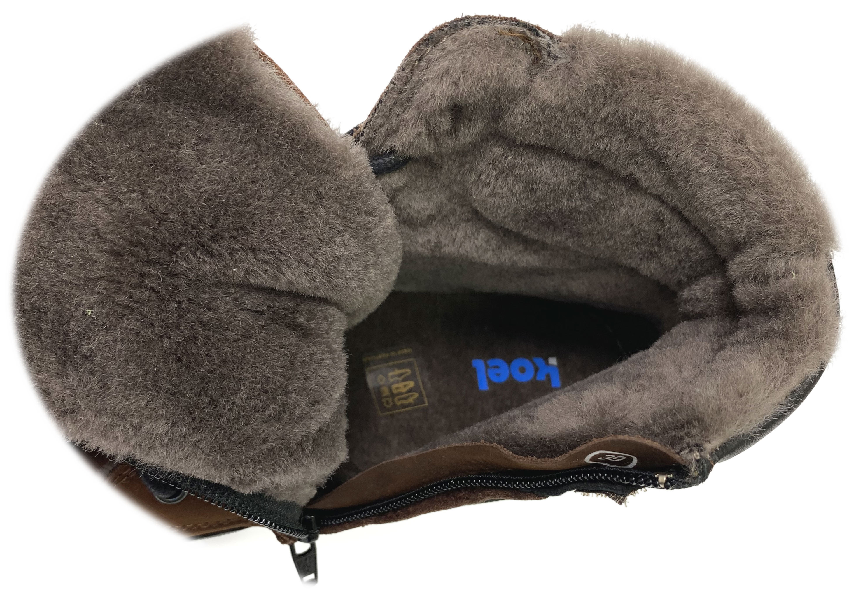 Schicke und warm haltende Barfußschuhe / Stiefel bis Mitte der Wade gehend, aus Hydro Leder, mit mittlerer bis schmaler Paßform, quer und längs flexible Bernadino Sohle mit minimal Profil, innen mit warm haltendem, dickem Lammwollfutter ausgelegt, herausnehmbare Innensohle ohne Erhöhungen von KOEL Barefoot.
