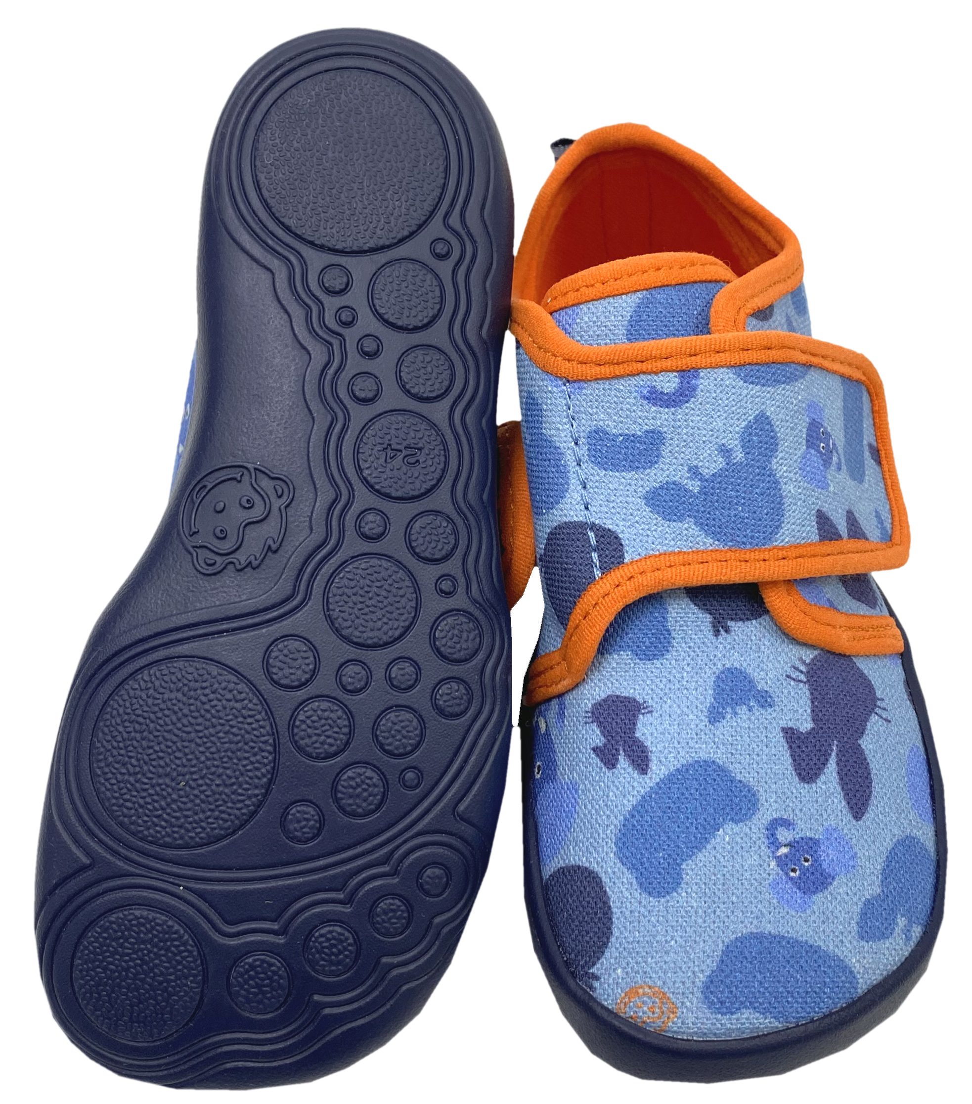 Super weicher, leichter Hausschuh in flacher Low Cut Höhe mit breitem Klettriegel zu schließen, aus robustem Canvas / Baumwolle, mit sehr flexibler Barfußsohle von AFFENZAHN - Modell Slipper Cotton Movy.