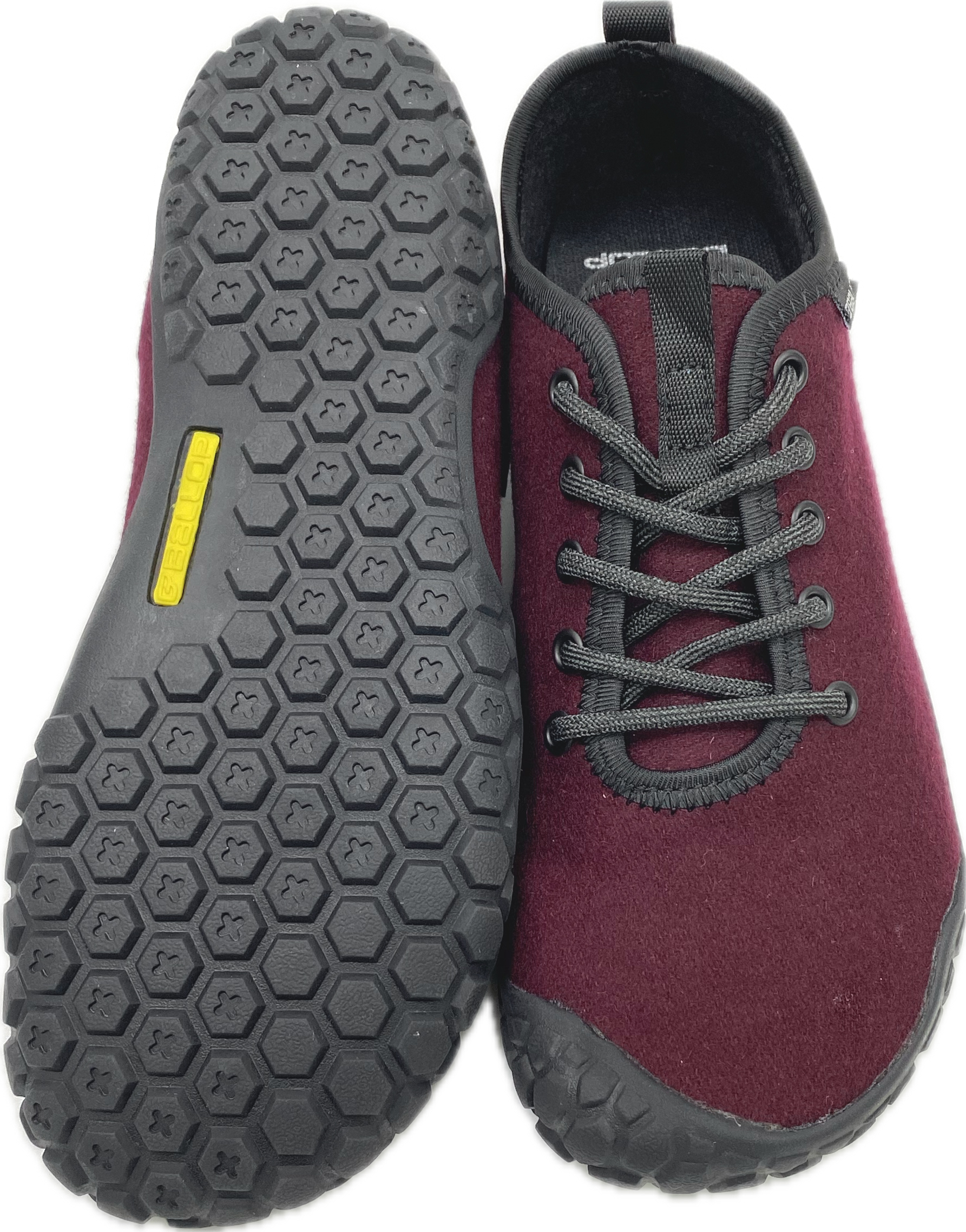 Sportlich lässiger Sneaker aus sehr gut Temperatur regulierendem Wollmix, mit einer richtig flexiblen und ganz leichten Barfußsohle / Minimalsohle in einem tief dunklem Bordeaux Rot Ton, zum schnüren von BALLOP.