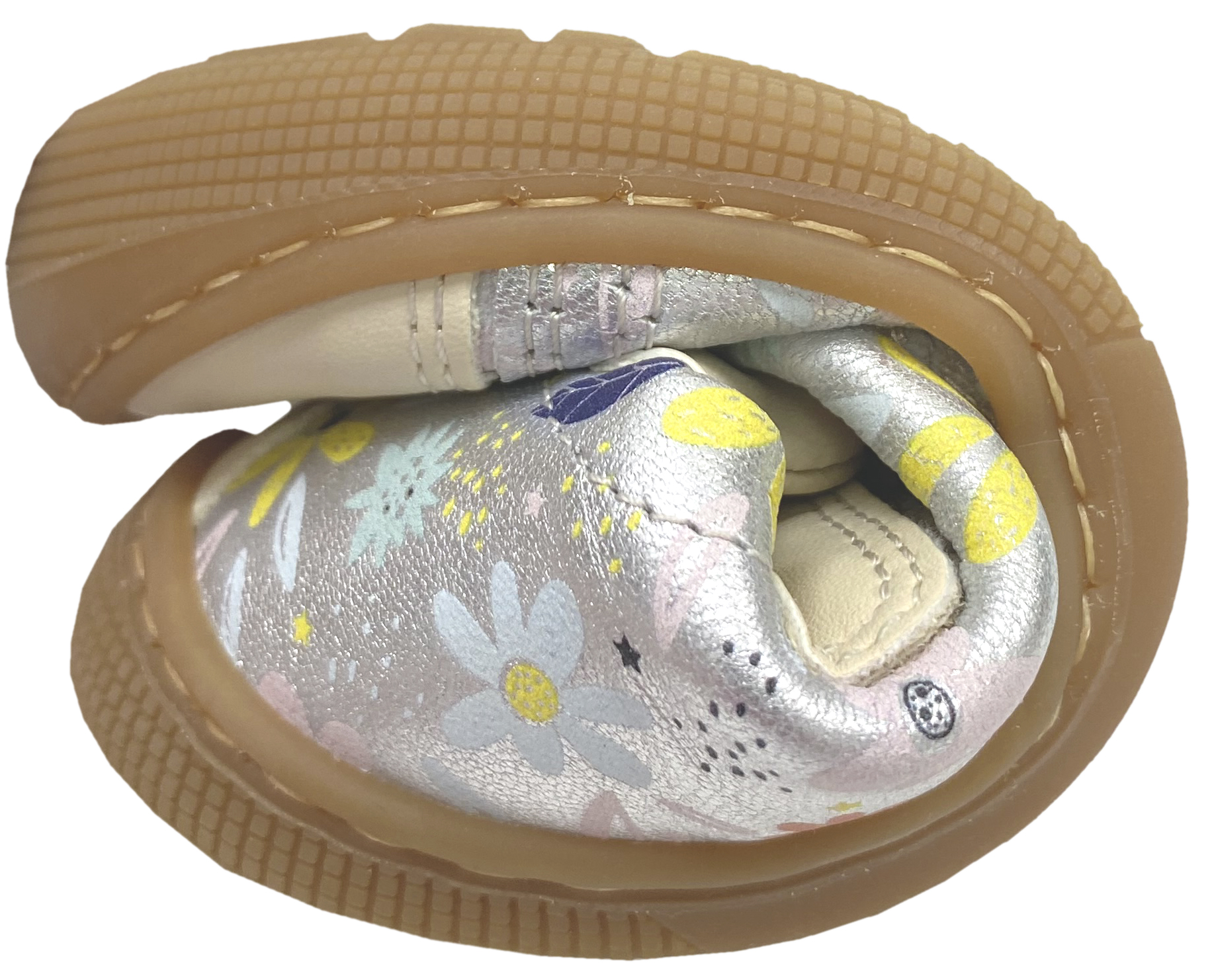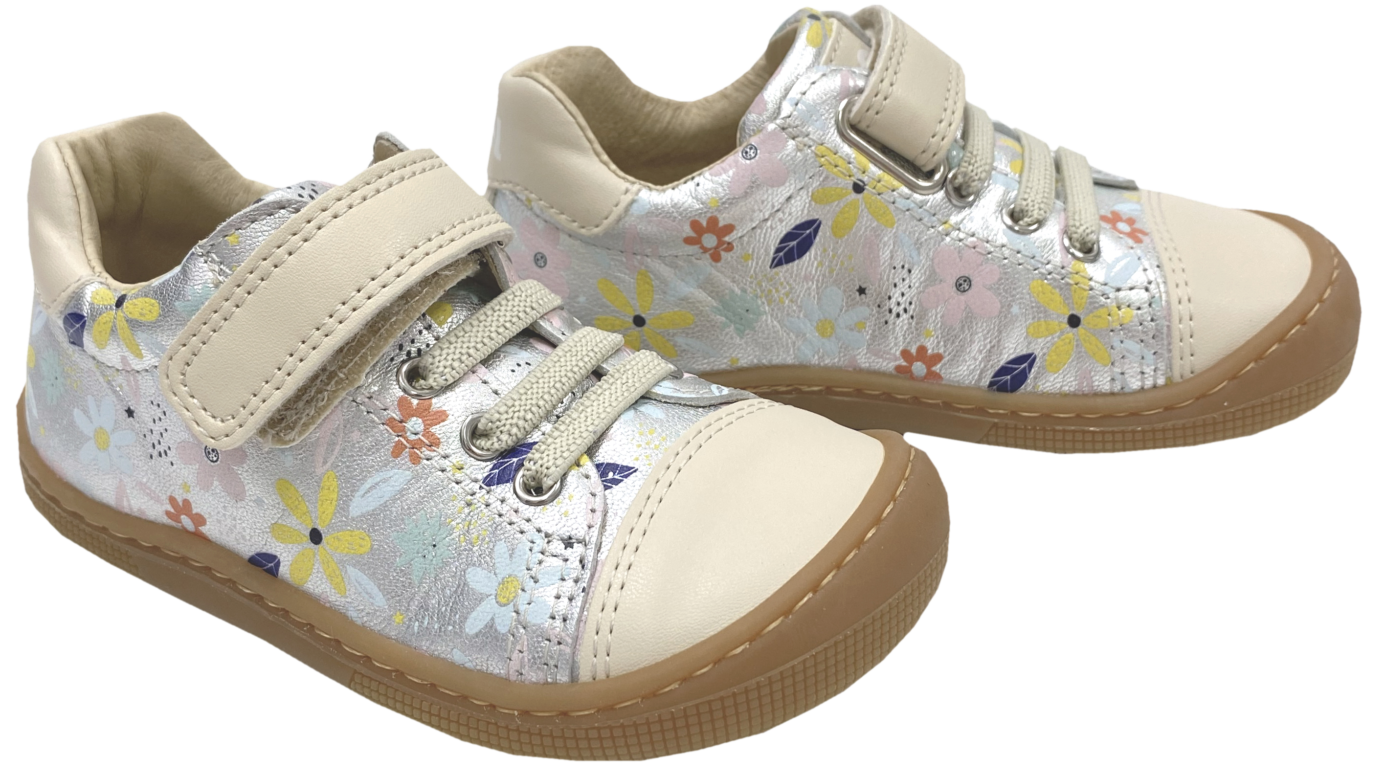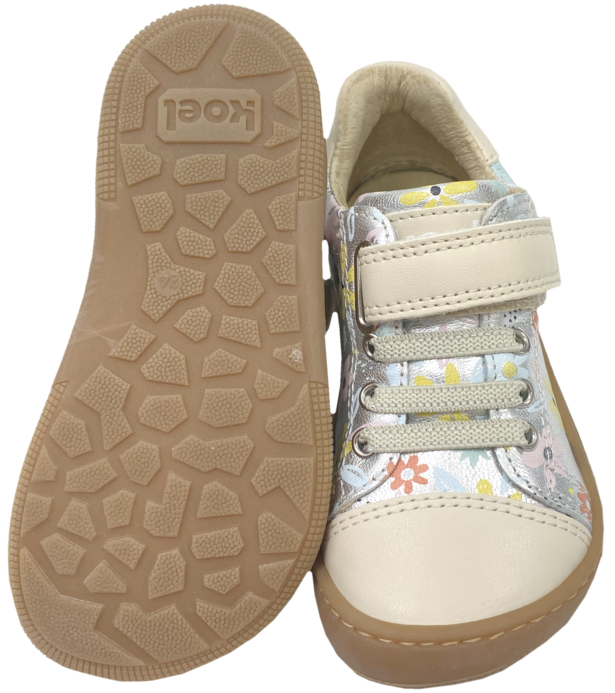 Ein kleiner glitzernder Mädchentraum :-) quer und längs flexible Barfußschuhe / Sneaker mit Minimalsohle, in flacher Low Top Höhe aus weichem Glattleder mit glitzerndem Blüten Druck, innen mit Glattleder ausgelegt, Innensohle herausnehmbar, auf dem etwas breiteren Leisten ( verglichen mit den Klassik / B Modellen von KOEL ) von KOEL Barefoot.