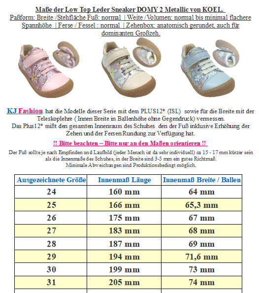 Sportlich schicke, quer und längs flexible Barfußschuhe / Sneaker mit Minimalsohle, in flacher Low Top Höhe aus weichem Glattleder mit modischen Streifen in Kontrastfarbe besetzt und einem süßen Einhorn Print seitlich, innen mit Glattleder ausgelegt, Innensohle herausnehmbar, auf dem etwas breiteren Leisten ( verglichen mit den Klassik / B Modellen von KOEL ) von KOEL Barefoot. > Bitte beachten Sie die im Bild angegebenen Maße, um unnötige Rücksendungen zu vermeiden. Bei Fragen wenden Sie sich gerne vor dem Kauf per E-Mail an uns. Ihr Team KJ Fashion! < Modell: Dakota Print in Mint mit Einhorn, 07M058.101Material: softes Nappaleder | Innen: Glattleder | Sohle: Gummi / Bernardino SohleWeite (diese bezieht sich auf das Volumen im Schuh) für normal hohen bis minimal flacheren Spann geeignet | Leisten (Stehfläche Fuß) normal | Mittelfuß: normal | Ferse: normal | Fessel: normal bis breit | Zehenbox: anatomisch gerundet geformt, auch für dominanten Großzeh geeignet - Low Top Sneaker bis knapp unter dem Gelenkknöchel endend - abgepolsterter, überarbeiteter Einstieg für ein angenehmes Tragegefühl, komplett mit weichem, glatten Leder ausgelegt - abgepolsterte Zunge mit Logo Stanzung - breiter Klettstreifen zum regulieren, auf dem Mittelfuß eine elastische Zierschnürung für die coole Optik - herausnehmbare Innensohle mit Leder bezogen ( Bitte regelmäßig zum durchlüften herausnehmen) - quer und längs flexible Gummisohle mit Minimalprofil - an der Spitze im Zehenbereich ist die Sohle etwas hochgezogen als Schutzkante Der optimale Schuh für Kids dir es stylisch trendy lieben von KOEL Barefoot. !! Bitte beachten - für extreme Nutzung durch Bobby Car / Laufrad / Fußball - erhöhter Abrieb der Sohle auf Asphalt z.B. bitte geeeignete Schutzkappen über die Schuhe ziehen - da diese dafür nicht ausgelegt sind !!