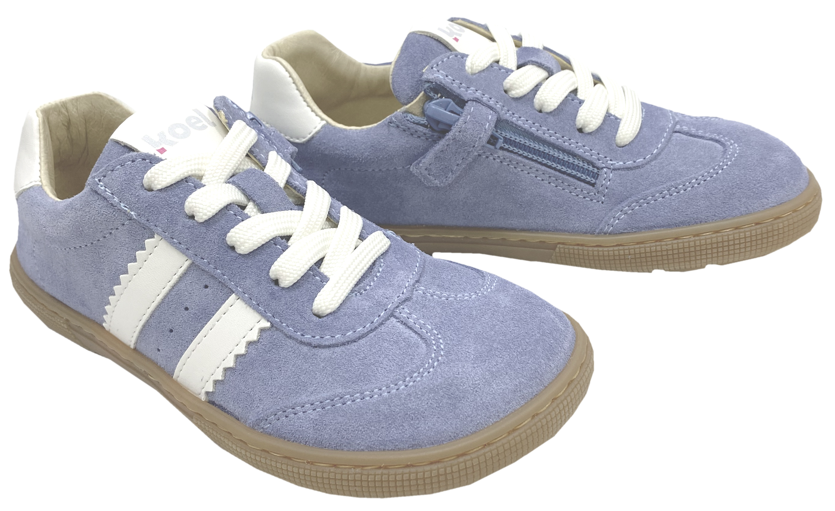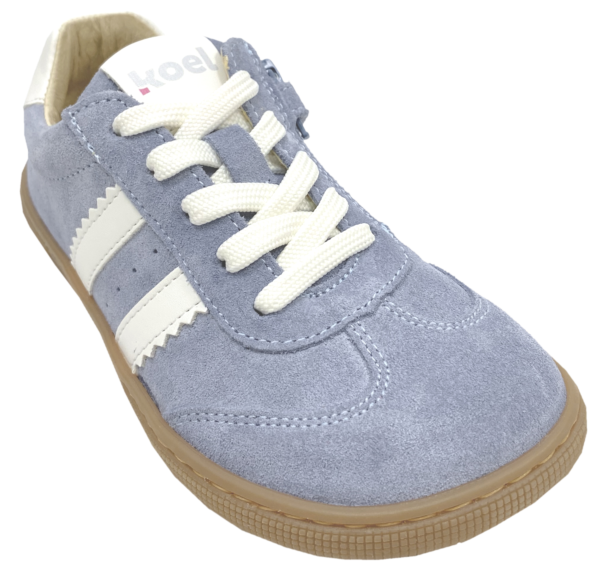 Lässig coole und absolut flexible Barfußschuhe, Low Top Sneaker aus weichem Wildleder mit sportlichen zwei hellen Streifen seitlich, innen mit weichem Glattleder ausgelegt, Innensohle ohne Erhöhungen, herausnehmbar, auf dem etwas breiteren Leisten ( verglichen mit der Klassik Serie) mit normaler, gut variierbarer Spannhöhe von KOEL Barefoot.