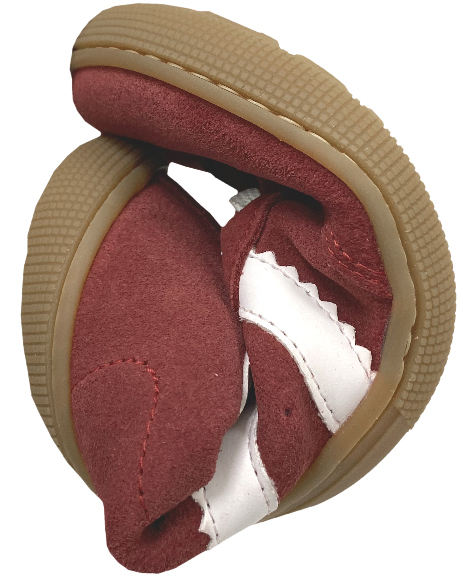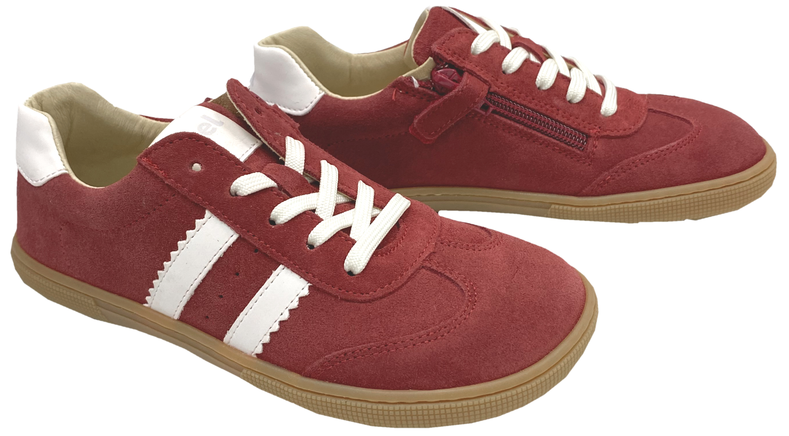Lässig coole und absolut flexible Barfußschuhe, Low Top Sneaker aus weichem Suede Leder / Wildleder mit sportlichen zwei hellen Streifen seitlich, innen mit weichem Glattleder ausgelegt, Innensohle ohne Erhöhungen, herausnehmbar, auf dem etwas breiteren Leisten ( verglichen mit der Klassik Serie) mit normaler, gut variierbarer Spannhöhe von KOEL Barefoot.