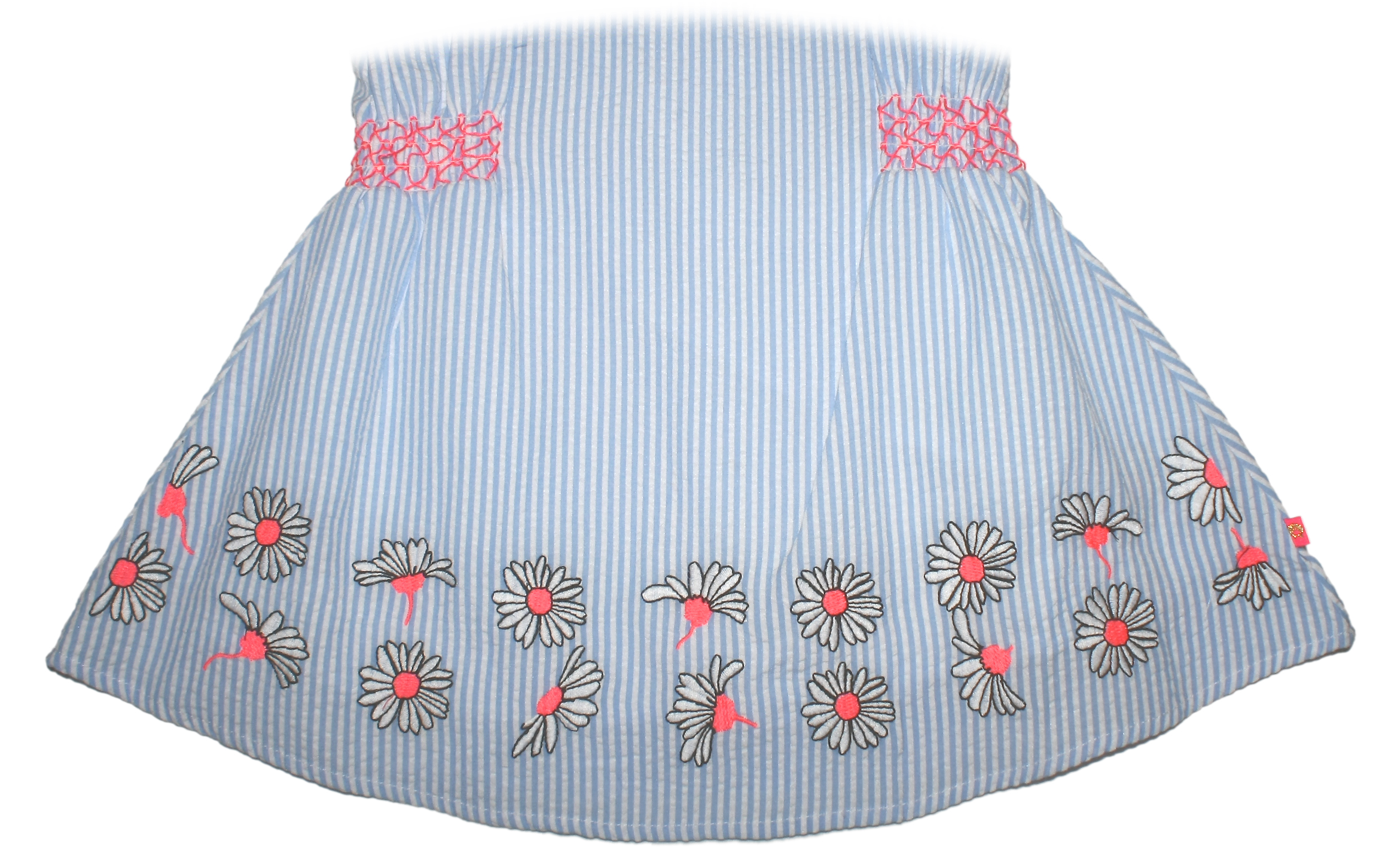 Wunderbar leichtes und weich auf der Haut liegendes Sommerkleid aus locker fallendem Baumwoll Krepp in Hellblau / Weiß gestreift, seitlich mit Neon Pinker Raffung, für Mädchen von dem belgischen Kindermode Label SOMEONE.
