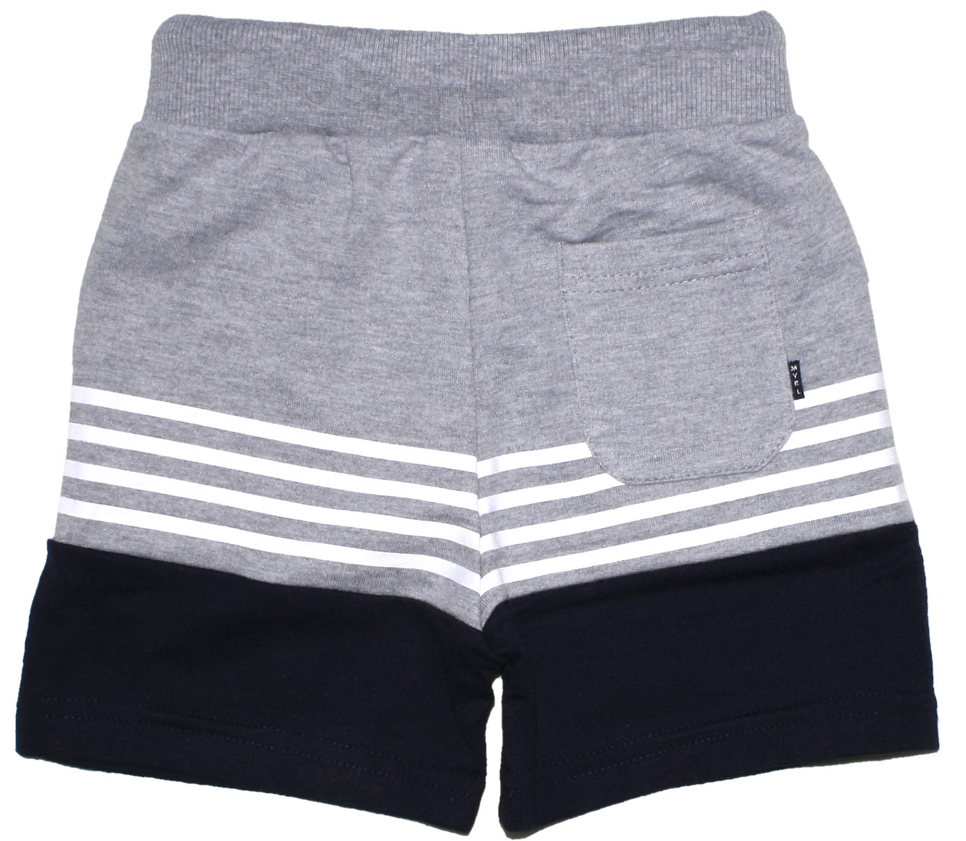 Super weiche und lässige Sweatshorts in hellem Grau Melange und Navy Blau mit weißen Streifen, Eingrifftaschen aus weichem Sommersweat, mit einem breiten Schlupfbund und Kordel zum regulieren der Weite, für Jungen von MAYORAL - dem Nr. 1 Kindermode Label aus Spanien.