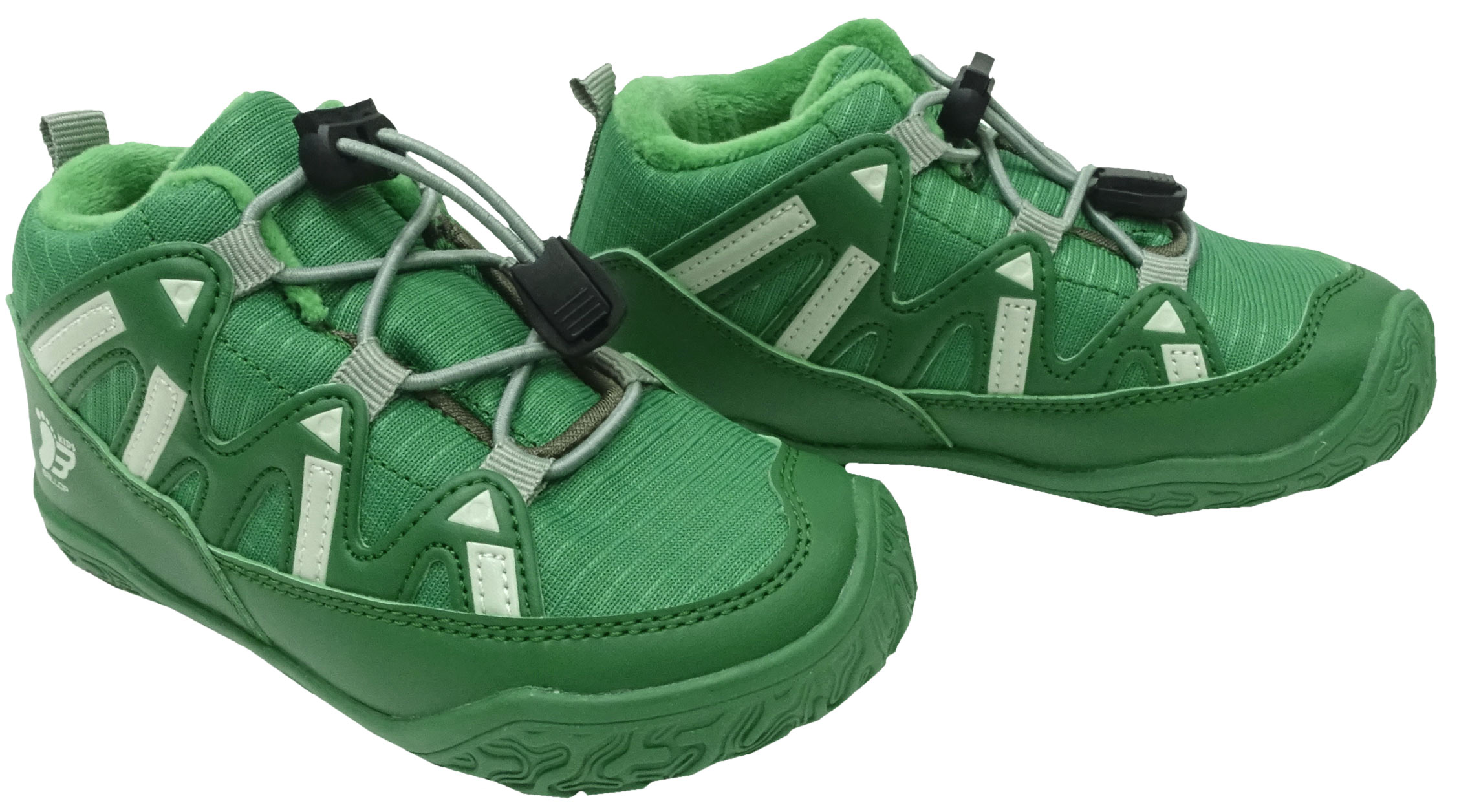 Sportlicher Barfußschuh in kräftigem Grün, in Knöchelhoher Mid Top Höhe, mit super weicher und flexibler Sohle, super zu regulierender Elastikschnürung für ein optimales anpassen an den Fuß des Kindes, mit einer wasserdichten ( bis zur Wasserlasche ) TEX Membran gearbeitet, von BALLOP mit der Barfußschuh Linie für Kids.