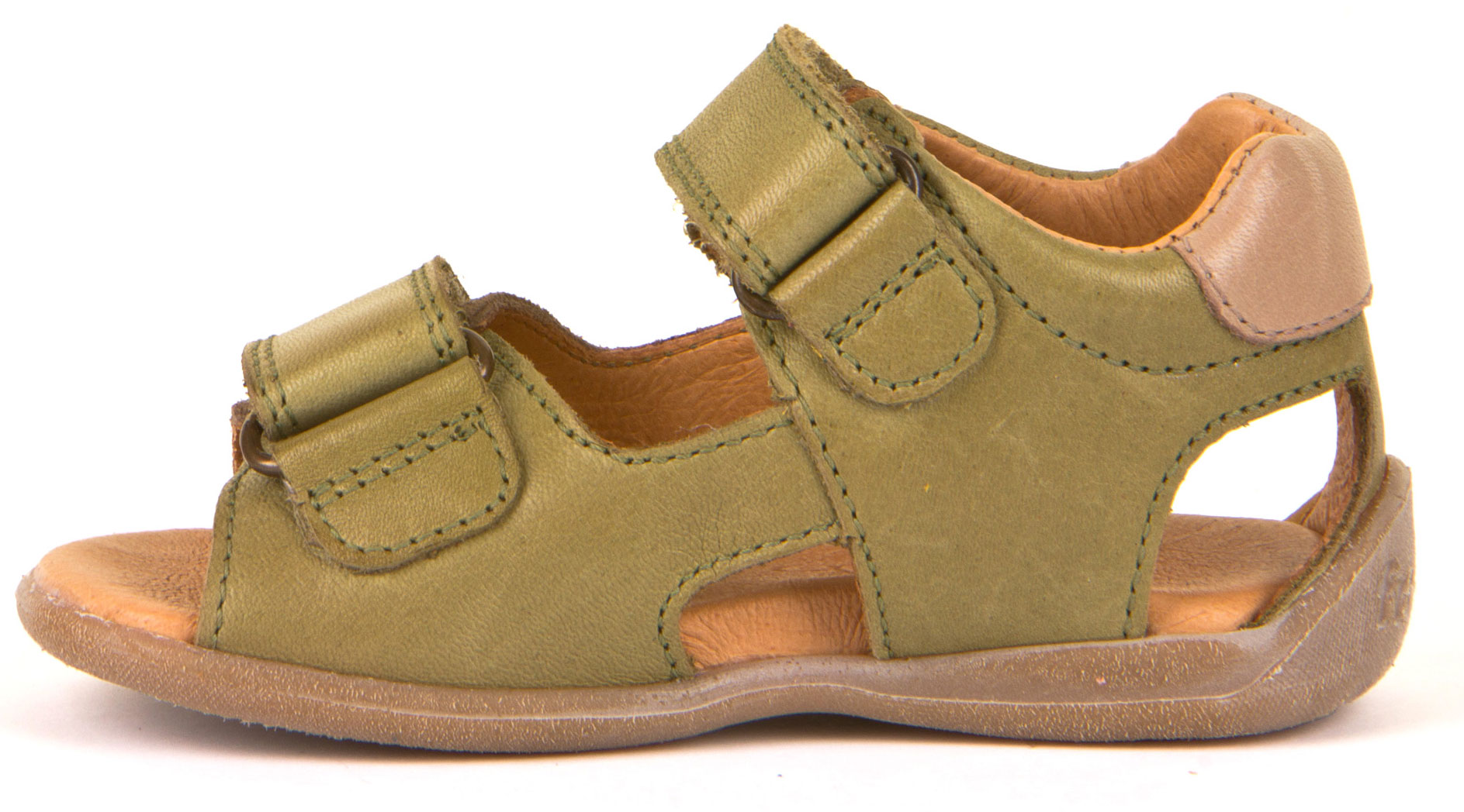 Sportlich schicke Sandale mit offener Zehenbox aus weichem Kalbsleder, mit zwei Klettriegeln, zum anpassen der Spannhöhe, weichem Lederfußbett, in einem gedeckten Oliv Ton, für Kinder von dem kroatischen Schuhhersteller FRODDO.