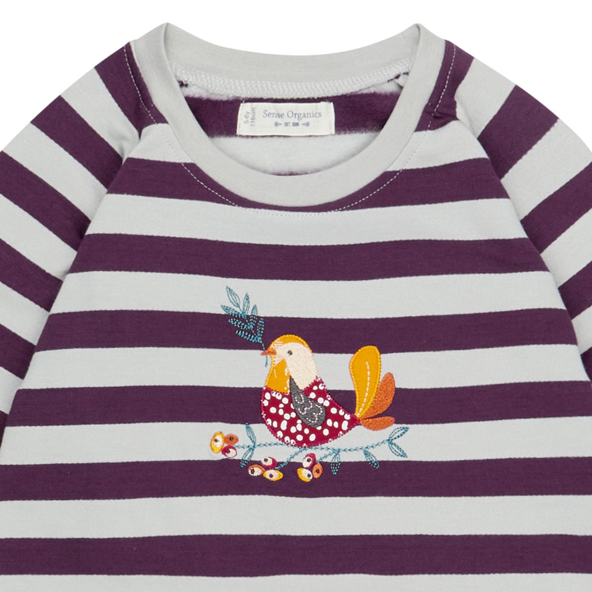 Bequem geschnittener Raglansweater aus ganz weichem Bio Baumwoll Sweat, mit GOTS Zertifizierung, in einem hellen Grau und kräftigem Violett gestreift, mit wertiger Vogel Applikation auf dem Bauch für kleine Mädchen von Sense Organics.