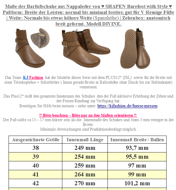 Schlichte gefütterte Barfußschuhe für kalte Tage in halbhoher Stiefel Form mit warm haltendem Schafswollfutter aus hydrophobiertem Nubukleder von SHAPEN Barefoot aus der Slowakai, hergestellt in der Europäischen Union. > Bitte beachten Sie das Maßbild und unsere Passform-Hinweise, um Rücksendungen zu vermeiden. Bei Fragen kontaktieren Sie uns gerne vor dem Kauf per Mail. – Ihr Team KJ Fashion < Modell: COZY 2.0 Nubuck in BordeauxMaterial: Hydrophobiertes Nubukleder | Futter: Schafswolle , Innensohle fest verklebt aus Schafswolle | Sohle: robustes SBR Gummi, sehr gut quer und längs flexibel mit einer Stärke von 4 mm + 4 mm ProfilPaßform: Weite (diese bezieht sich auf das Volumen): für normal hohen bis minimal höheren Spann geeignet | Breite (Stehfläche Fuß) Normal bis etwas breiter, gerade im Vorfuß | Ferse: normal | Zehenbox: sehr gut anatomische Form, für dominanten Großzeh geeignet - Winterschuhe bis gut über den Gelenkknöchel gehend, bis etwa zur Mitte der Wade - gut sitzender Schaftabschluß, variierbar durch die Schnürung - seitlich mit einem Reißverschluß zu öffnen - innen mit einem kuschelig weichen Wollfutter ausgelegt, auch die Innensohle ist abgefüttert - Vorfußbereich angenehm weit und breit geschnitten zum optimalen auffächern der Zehen beim laufen - Laufsohle aus Styrol-Butadien Kautschuk, sehr robust aber dennoch quer und längs flexibel, fest vernäht für eine lange Lebensdauer, mit 4 mm Profil für einen guten Grip Ein super bequemer, warm gefütterter Barfußschuh ohne jegliche Erhöhungen, absolut weich und hergestellt in der EU - von SHAPEN Barefoot.