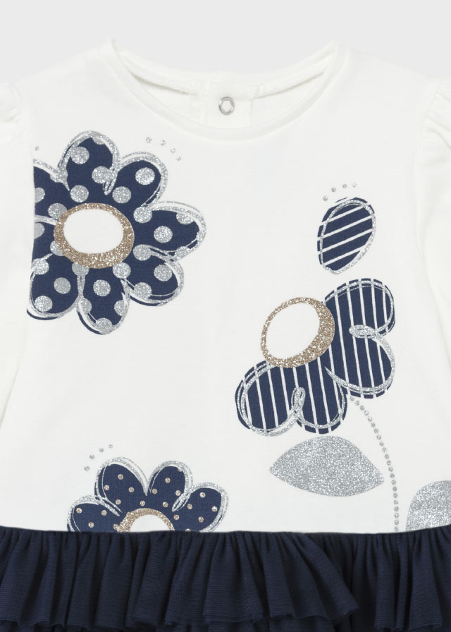Schickes Kleid Langarm in Offwhite mit Blau / Silber glitzernden Blüten & Tüllrock von MAYORAL 2915
