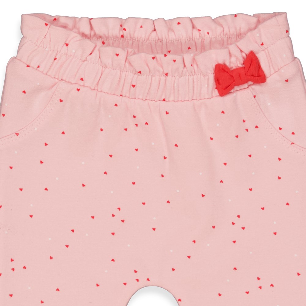 Niedliche Schlupfhose, Sommersweat Hose im lässig sitzenden Baggy Stil, in hellem Rosa mit kleinen, roten Herzen Allover, gerüschte, dehnbare Abschlüsse für optimalen Sitz, für kleine Mädchen von dem Niederländischem Babymode Label FEETJE.