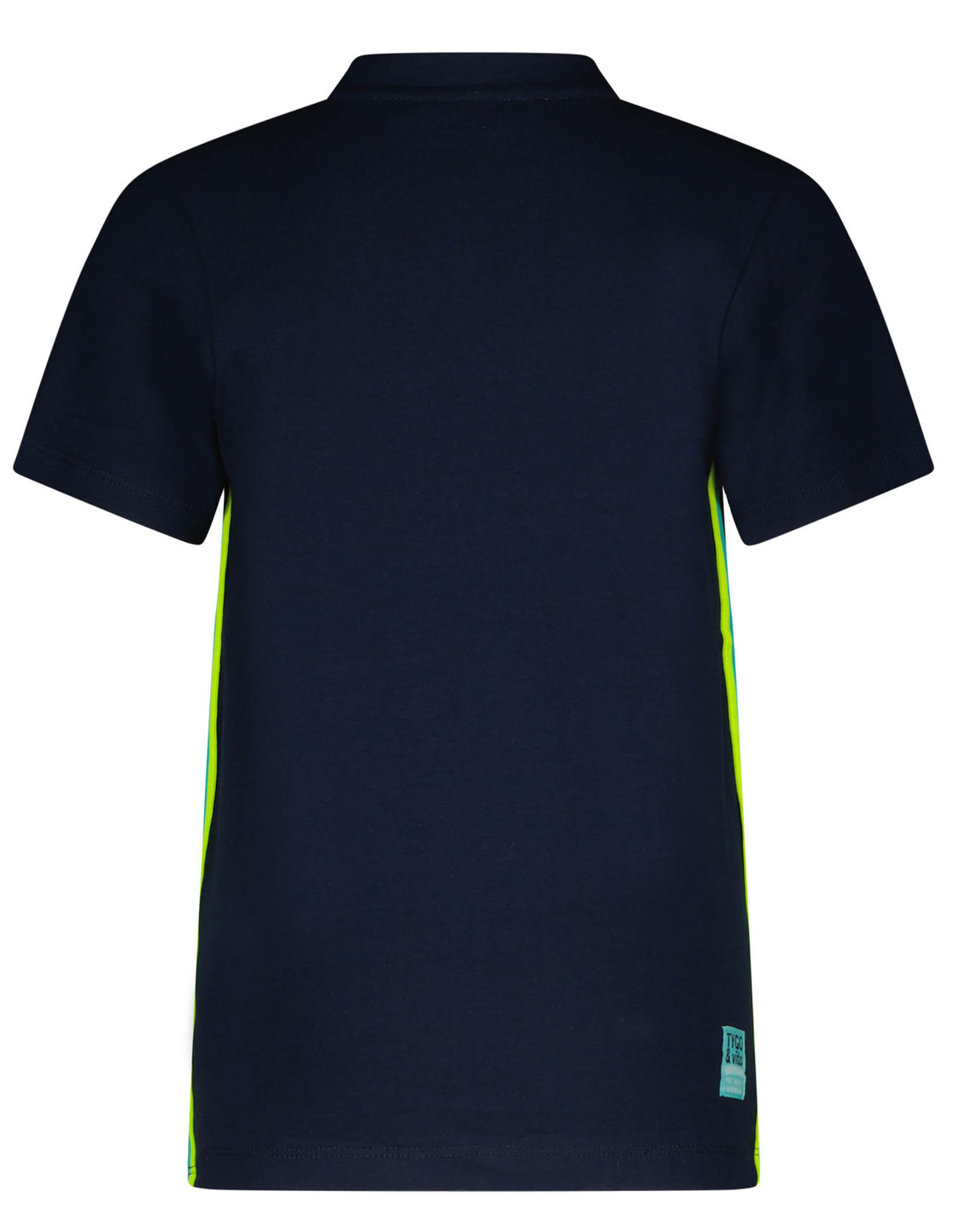 Schmal geschnittenes T-Shirt in einem dunklen Navy Blau Ton mit Neon buntem Print auf der Front, seitlichem Webband in Neon Grün und Weiß Tönen, aus weichem BW Jersey für Jungen von dem niederländischem Label TYGO & vito.