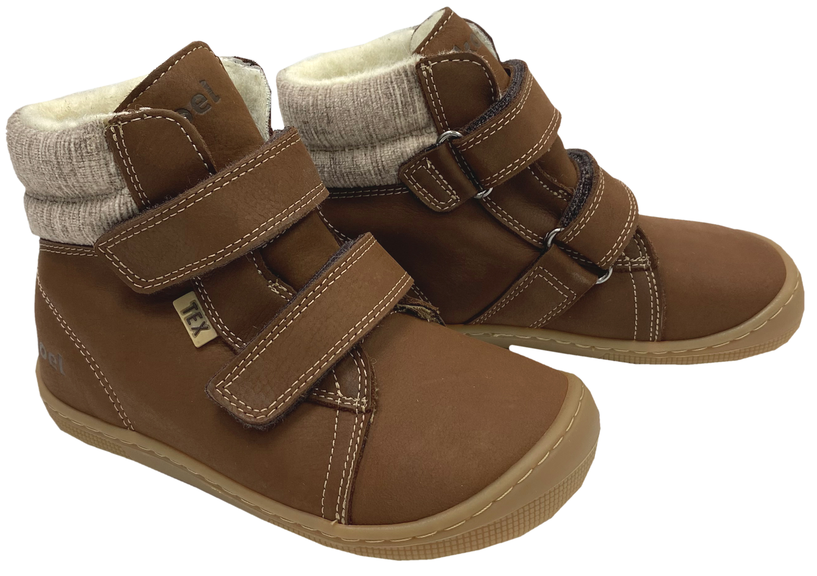 Robuste Barfußschuhe / Winterstiefel mit Tex Membran aus hydrophobiertem Leder und einem Besatz am Einstieg aus samtigem Textil wie Cord im Griff, mit Doppelklett zu öffnen, innen mit Schurwollfutter ausgelegt, minimal quer und längs flexible Gummigrippsohle auf dem mittelbreiten Leisten ( breite Zehenbox, normale Paßform) von KOEL Barefoot.