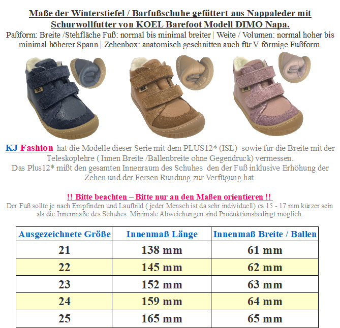 Robuste Barfußschuhe / Winterstiefel mit Tex Membran aus Glattleder mit Doppelklett zu öffnen, innen mit Schurwollfutter ausgelegt, minimal quer und längs flexible Gummigrippsohle auf dem mittelbreiten Leisten ( breite Zehenbox, normale Paßform) von KOEL Barefoot. > Bitte beachten Sie die im Bild angegebenen Maße, um unnötige Rücksendungen zu vermeiden. Bei Fragen wenden Sie sich gerne vor dem Kauf per E-Mail an uns. Ihr Team KJ Fashion! < Modell: DEMIL Wool 07T053.102 - 110 BlueMaterial: Leder - stark Wasserabweisend dank Tex Membran zwischen den beiden Schichten | Innen: Schurwolle Mulesing Frei | Sohle: Gummi Gripp Sohle ( Bernardino Sohle)Weite ( diese bezieht sich auf das Volumen ) für einen normal / mittel hohen Spann geeignet | Leisten -Breite (Stehfläche Fuß) normal | Mittelfuß: normal | Ferse: normal | Zehenbox: anatomisch gerundet geformt - Barfußschuhe für die kalten Tage bis etwa Mitte der Wade gehend für einen guten Schutz vor Schnee / Regen - abgepolsterter Einstieg, innen mit weicher, nicht zu voluminöser Schurwolle ausgelegt, zwischen den beiden Materialien mit einer Tex Membran gearbeitet ( Bitte beachten das Tex Membran nur funktionieren wenn es außen kälter als im Schuh ist, und diese GUT durchtrocknen kann ) - mit zwei Klettstreifen zu öffnen, optimal an den Fuß anzupassen - herausnehmbare, mit Wollfilz bezogene Innensohle - flexible Gummisohle mit gutem Gripp Profil, durch das Futter sowie die TEX Membran ist die Sohle weniger knautschig weich als Modelle ohne Futter und ohne Tex, durch Bewegung weicht sich das Material nach - an der Spitze im Zehenbereich ist die Sohle hochgezogen als Schutzkante Der optimale Schuh für die kalten Tage von KOEL Barefoot. !! Bitte beachten - für extreme Nutzung durch Bobby Car / Laufrad / krabbeln mit der Spitze etc bitte geeeignete Schutzkappen über die Schuhe ziehen - da diese dafür nicht ausgelegt sind !! !! TIP bei kalten Füßen - tragen sie am besten Socken die nicht zu eng am Fuß sitzen aus Wolle, da diese sich am Fuß des Kindes nicht so schnell feucht und sich damit kalt anfühlen wie eine Socke aus Baumwolle - auch Funktionssocken leiten die Feuchtigkeit des Fußes hervorragend ab, so das das Kind nicht so schnell kalte Füße durch feuchte Socken bekommt -> Hier geht es zu unseren Woll und Funktionssocken <
