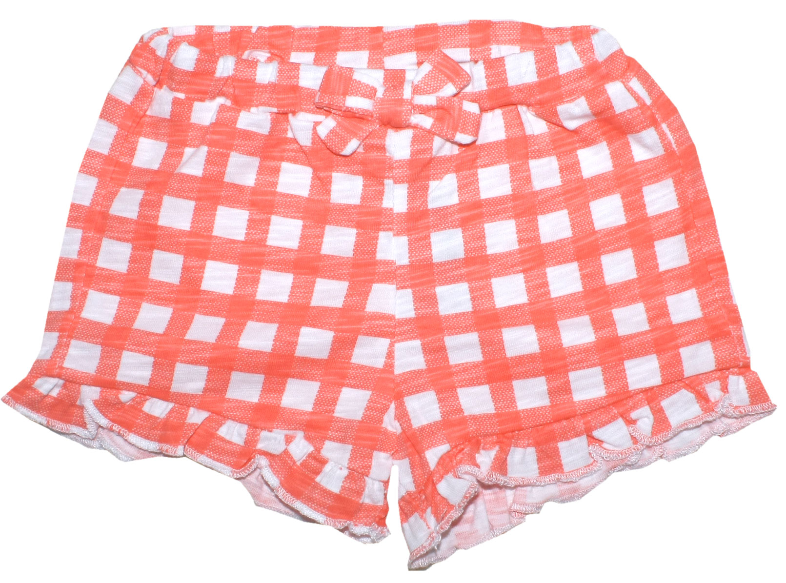 Luftig leichtes Sommerset für kleine Mädchen bestehend aus einer Tunika mit Flatterärmelchen, in Weiß mit süßem Blumen Print, dazu passend eine kurze Shorts in Orange Weiß kariert von MAYORAL - dem Nr. 1 Kindermode Label aus Spanien.