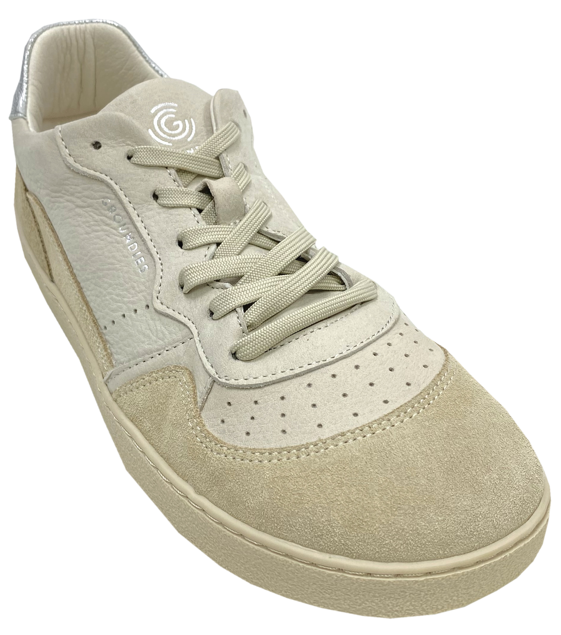 Lässig schicke Sneaker / Barfußschuhe aus mattem Glatt und Velourleder Mix in Natur / Beige mit kleinem Silbernen Einsatz an der Ferse, von GROUNDIES - Modell Nova auf der GS1 Sohle und der anatomisch geformten Zehenbox, einem komplett neutralem Fußbett ohne jegliche Erhöhungen - für ein bequemes Barfuß - laufen - Gefühl.