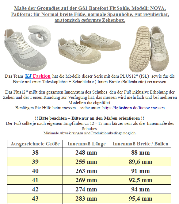 Sportlich schicke Sneaker / Barfußschuhe aus Glatt und Velourleder Mix in Weiß mit Einsätzen in Grau mit Silber Metallic abgesetzt, für Damen von GROUNDIES - Modell Nova auf der GO1 Sohle und der anatomisch geformten Zehenbox, dem komplett neutralem Fußbett ohne jegliche Erhöhungen - für ein bequemes Barfuß - laufen - Gefühl. !!Bitte beachten sie die als Bild hinterlegte Tabelle der Maße um so ein unnötiges hin und her senden zu vermeiden - bei Fragen mailen Sie uns einfach vor dem Kauf an - Ihr Team KJ Fashion !! Modell: Nova GO1 2.0 White / MetallicMaterial: Nubuk Leder & Glatttleder | Innen: atmungsaktives OnSteam® Mikrofaser Gewebe | Original TrueSense® GO1 Sohle mit 3 mm Basis und 3,3 mm Profil | FlachsenkelWeite (diese bezieht sich auf das Volumen im Schuh) M - also für normal hohen Spann geeignet | Leiste (Stehfläche Fuß) normal | Mittelfuß: normal | Ferse: normal | Zehenbox: anatomisch gerundet - schicker Retro Sneaker in Weiß mit Kontrasteinsätzen aus Glatt- und Velourleder - mit Ton in Ton gehaltenen Flachsenkeln optimal an den Fuß anzupassen - innen mit angenehm zu tragendem Mikrofaser ausgelegt für ein gutes Fußklima, Innensohle fest vernäht - Fersenbereich leicht abgepolstert für ein angenehmes Tragegefühl - mit der anatomisch geformten Zehenbox für normal breite Füße optimal zu tragen - auf der super weichen, flexiblen GO1 Sohle für das absolute Barfußgefühl Ein sportlich schicker Sneaker für Damen von GROUNDIES.