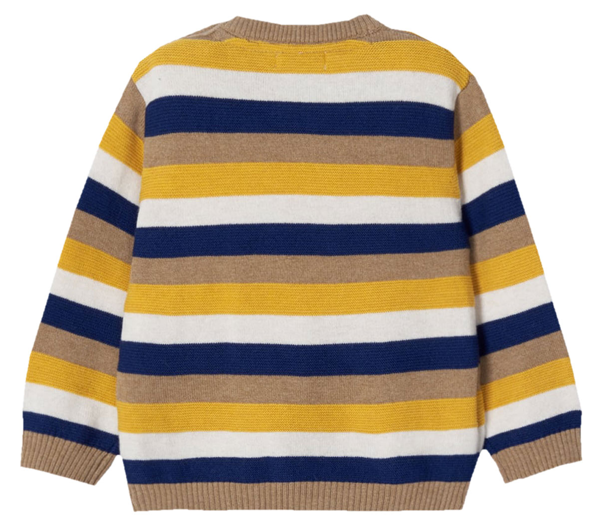 Wunderschöner, wertig gearbeiteter Strickpullover aus weichem Woll / Baumwoll Mix in tollen Beige / Blau / Gelb Tönen gestreift mit geripptem Rundhalsausschnitt für die Kleinsten unter uns, von dem spanischen Nr 1 Label für hochwertige Kindermode.