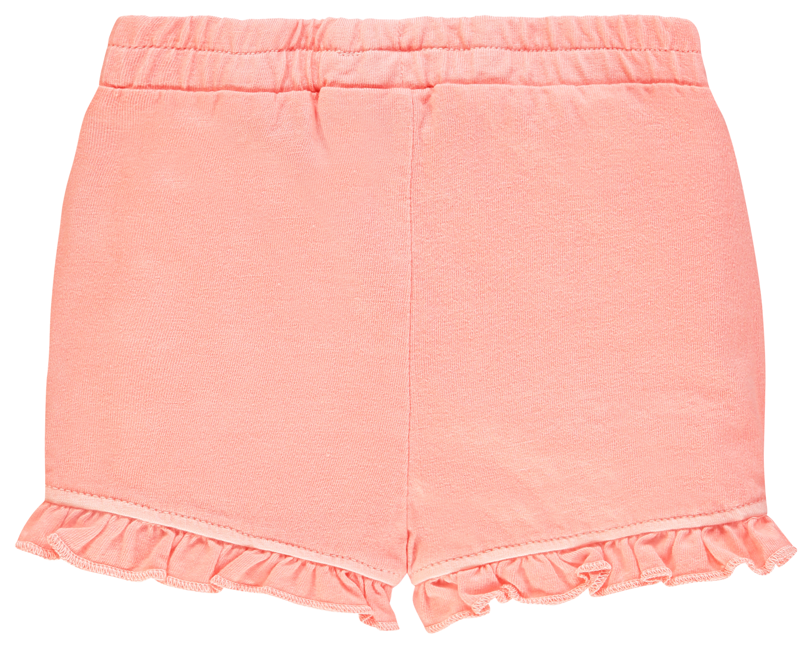 Sommerlich leichte Shorts in kurzer Beinlänge in eine gewaschenem Apricot Ton, mit Schlupfbund und Volantkante am Abschlußsaum für kleine Mädchen von dem Niederländischem Baby- , Kinder- und Schwangerschafts Label NOPPIES.
