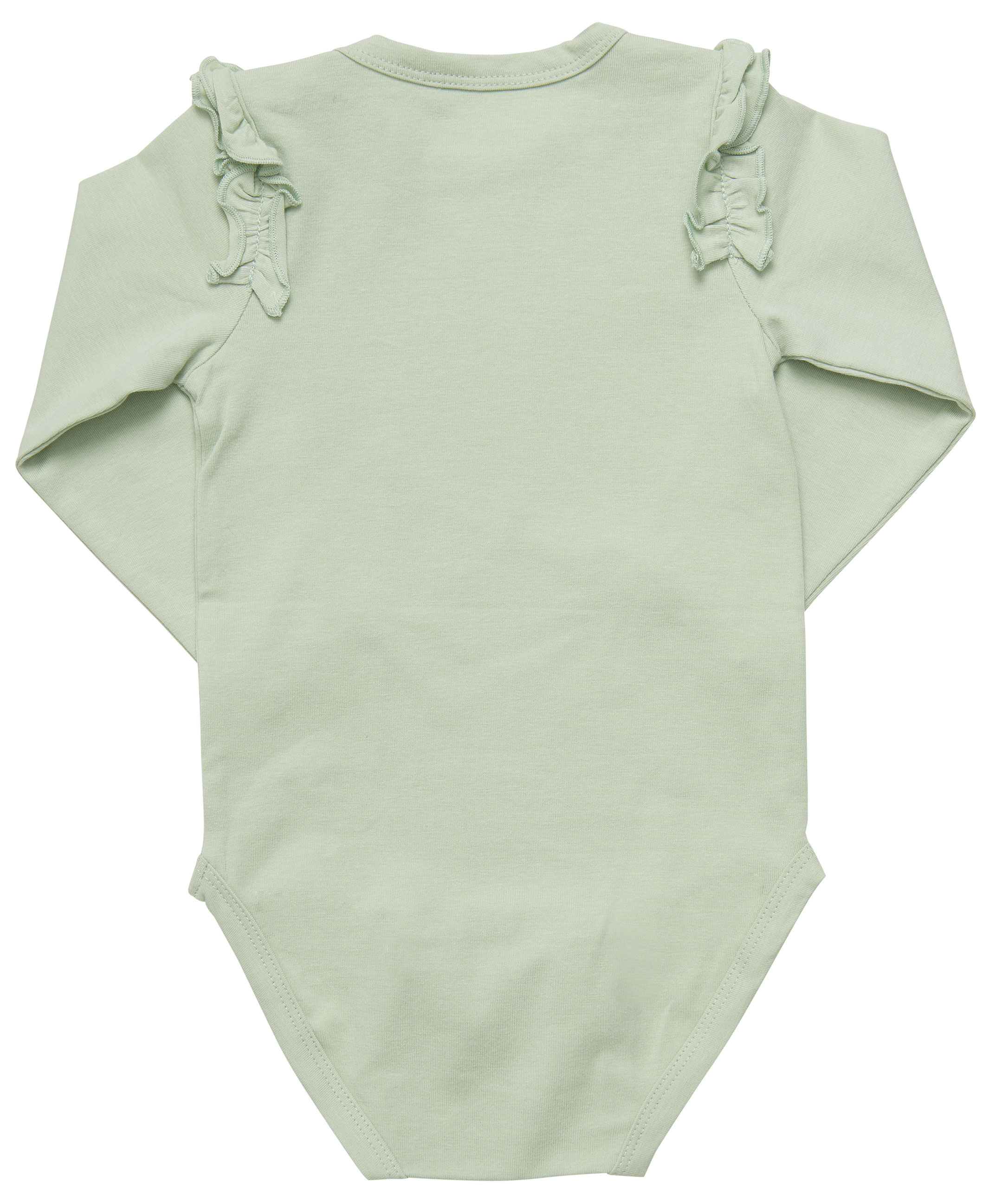 Schicker Langarmbody in einem zarten Mint Ton mit Flower Print mittig und kleiner aufgsetzter Rüschenkante an den Schultern, aus ganz weichem Bio Baumwolljersey für kleine Mädchen von dem dänischen Kindermode Hersteller MINYMO / Brands 4 Kids Group.