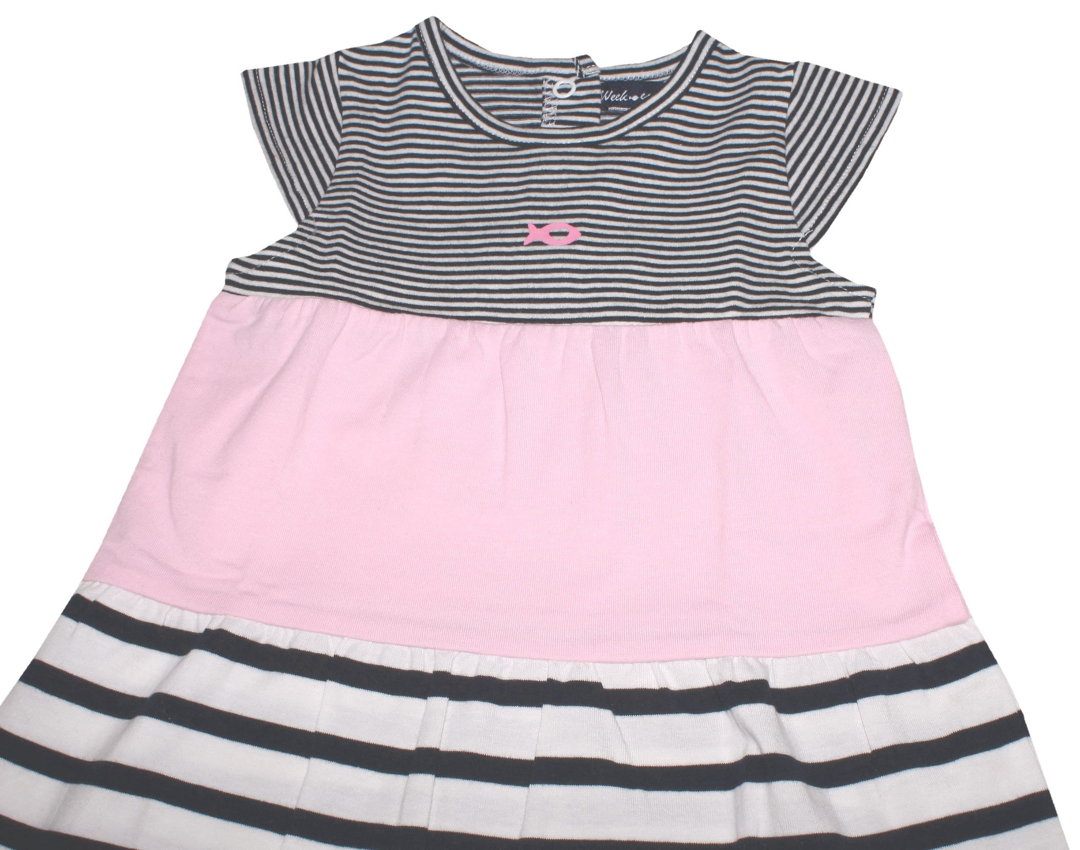 Zauberhaft schickes und locker leichtes Shirtkleid mit kurzem Arm aus weichem Baumwoll Jersey in Navy Weiß geringelt, mittig in einem zarten Rosa Ton, für kleine Mädchen von dem französischem Label Week End A La Mer.