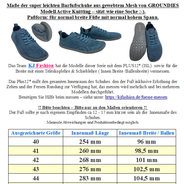 Sportlich lässige Barfußschuhe aus luftig leichtem und dehnbarem Mesh Gewebe mit Bambus Anteil, mit breiter - anatomischer Zehenbox, super flexibler, weicher GO1 Sohle komplett neutralem Fußbett ohne jegliche Erhöhungen von GROUNDIES. !!Bitte beachten sie die als Bild hinterlegten Maße, um so ein unnötiges hin und her senden zu vermeiden - bei Fragen mailen Sie uns einfach vor dem Kauf an - Ihr Team KJ Fashion !! Modell: Flex Blue / NavyMaterial: Bamboo 3D 82% PA ( davon 52% recycelt) + 18% Bambus | Innen: Bambus | Innensohle: on Steam 90% PA Microfaser + 10 PU | Original TrueSense® GO1 Sohle mit 3,3 mm Basis und 3 mm Profil Weite (diese bezieht sich auf das Volumen im Schuh) M - also für normal hohen bis minimal höheren Spann geeignet | Leisten (Stehfläche Fuß) normal | Mittelfuß: Normal / MIttel | Ferse: normal | Zehenbox: anatomisch gerundet geformt - richtig leichte und luftige Sneaker für den Alltag oder auch optimal zum Sport aus anschmiegsamem Mesh Gewebe - mit metallenen Ösen und Flachsenkeln zu schließen - innen mit angenehm zu tragender Bambusfaser ausgelegt für ein gutes Fußklima, Innensohle fest vernäht - Fersenbereich leicht abgepolstert für ein angenehmes Tragegefühl - mit einer bequemen Paßform für absolute Freiheit für normal breite Füße - auf der flexiblen GO1 Sohle für ein absolut angenehmes Barfußgefühl mit ausreichend Grip Ein sportlich schicker Sneaker / Minimalschuh on GROUNDIES.