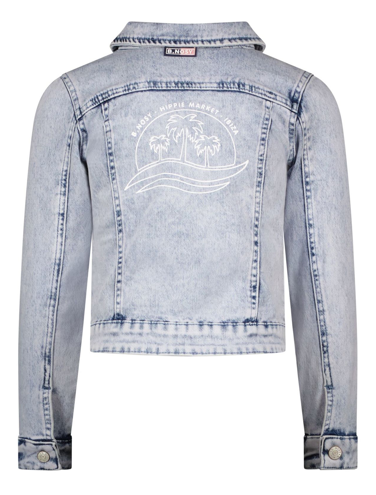 Absolut trendige und super lässige Jeansjacke in einem hellen Acid Bleached Blau Ton, mit gerüschter Kante vorn und einem Palmen Print auf dem Rücken von dem Niederländischem Label B.NOSY.