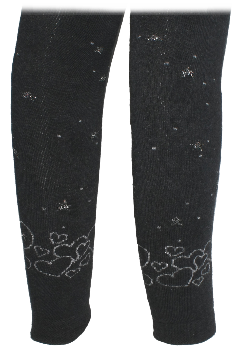 Kuschelig weiche und warm haltende Thermo Leggings / Strumpfhose ohne Fuß aus weichem Baumwoll Vollfrottee, weich und angenehm auf der Haut in dunklem Anthrazit mit glitzernden Sternen und kleinen Herzen im unteren Bereich versehen, von MAXIMO aus Chemnitz.