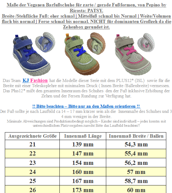 Absolut leichte ( Gr. 24 als Paar 215 Gramm), quer und längs flexible Halbschuhe ( Kompromiss Schuhe wegen der runderen Zehenbox ) aus rein veganem High Tech Gewebe, innen mit Textil ausgelegt für eher zarte, schmale Füße ( Paßform - BITTE nicht mit der WMS Weite also dem Volumen / Spannhöhe verwechseln) von PEPINO by RICOSTA Barefoot. > Bitte beachten Sie die im Bild angegebenen Maße, um unnötige Rücksendungen zu vermeiden. Bei Fragen wenden Sie sich gerne vor dem Kauf per E-Mail an uns. Ihr Team KJ Fashion! < Modell: Patsy 501701402-150 Carbon / Kobalt!! Die Schuhe werden nach WMS mit dem M ausgezeichnet - es ist KEIN Schuh für Breite / Volumenreiche Füße - eher für schmale / gerade Füße mit flachem Spann !!Material: High Tech Gewebe | Innen: Textil mit fest vernähter Sohle | Laufsohle: NaturkautschukPaßform: (Standfläche Fuß - als Breite bezeichnet ) Schmal bis Mittel | Weite ( beschreibt das Volumen auch als Spannhöhe bezeichnet) : Flach bis Mittel | Mittelfuß: normal bis schmal | Ferse: normal bis schmal | Zehenbox: leicht gerundet geformt, nicht für dominante Großzehe - ganz weicher, knautschiger Halbschuh aus Veganen Materialien mit geringem Gewicht - Halbschuhe bis knapp über den Gelenkknöchel gehend für einen optimalen Sitz - mit elastischer Zierschnürung über dem Mittelfuß, breitem Klettstreifen am oberen Abschluß in Höhe des Gelenkknöchels zur Regulierung - super flexible Gummisohle mit leichtem Profil, an der Ferse und der Spitze hoch gezogen als Schutzkante Ein toller Schuh für die Kleinen Laufanfänger für eher zarte / schmale Kinderfüße aus dem Hause Pepino by RICOSTA aus der Barefoot Kollektion.