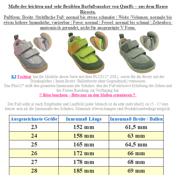 Sportlich lässige Minimalschuhe in flacher Sneaker Höhe aus der neuen Barfußschuh Kollektion von QNUFFS by Ricosta, weiches Leder, super quer und längs flexible Naturkautschuk Sohle und praktischer Doppelklett machen den Sneaker zu einem optimalen Barfußschuh für eher schmalere Füße. > Bitte beachten Sie die im Bild angegebenen Maße, um unnötige Rücksendungen zu vermeiden. Bei Fragen wenden Sie sich gerne vor dem Kauf per E-Mail an uns. Ihr Team KJ Fashion.! < Modell: Ahorn QN0010012 - 110 River / SalbeiMaterial: Leder / High Tech | Innenmaterial: Leder | Einlegesohle: herausnehmbar aus Textil | Laufsohle: NaturkautschukWeite (diese bezieht sich auf das Volumen im Schuh) für normal hohen bis minimal auch höheren Spann geeignet , da sehr gut regulierbar | Breite des Leisten (Stehfläche Fuß) normal bis schmal | Mittelfuß: normal bis schmal | Ferse: normal | Zehenbox: anatomisch gerundet geformt nicht für ausgeprägte V Form - Sneaker in flacher Low Top Höhe bis unter den Gelenkknöchel gehend - abgepolsterter Einstieg, innen mit weichem Glattleder ausgelegt - Zunge flach gearbeitet mit flachen Nähten - mit Doppelklett zu öffnen, optimal an den Mittelfuß anzupassen und so auch super im Umfang / der Weite zu regulieren - herausnehmbare textile Sohle ohne versteckte Erhöhungen / Polster, bitte diese regelmäßig zum lüften / säubern und plätten herausnehmen - quer und längs flexible Gummisohle mit Minimalprofil Zero Drop für ein optimales Bodengefühl Der optimale Schuh für den Übergang für Kinder mit etwas schmaleren bis normal breiten Füßen von QNUFFS - der neuen Linie für Barfußschuhe aus dem Hause Ricosta. !! Bitte beachten - für extreme Nutzung durch Bobby Car / Laufrad etc bitte geeeignete Schutzkappen über die Schuhe ziehen - da diese dafür nicht ausgelegt sind !!