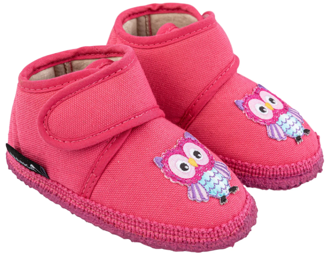 Schicker, super flexibler Hausschuh mit breitem Klett in der etwas höheren Variante für die ganz Kleinen in einem kräftigen Pink Ton mit niedlichem Eulen Stick auf der Front.