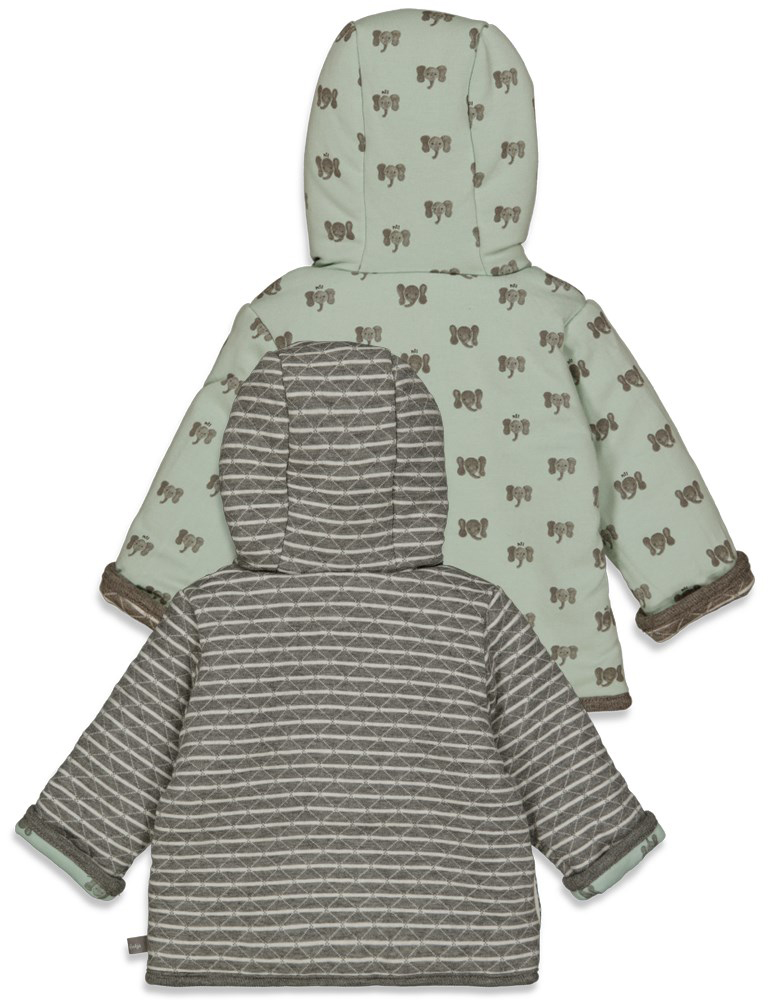 Ganz weiche und warm haltende Wendejacke aus wattiertem Steppsweat in Grau Melange / Offwhite gestreift - die Wendeseite aus Bio BW Jersey in Mint mit niedlichem Elefanten Print Allover von dem Niederländischem Babymode Label FEETJE.