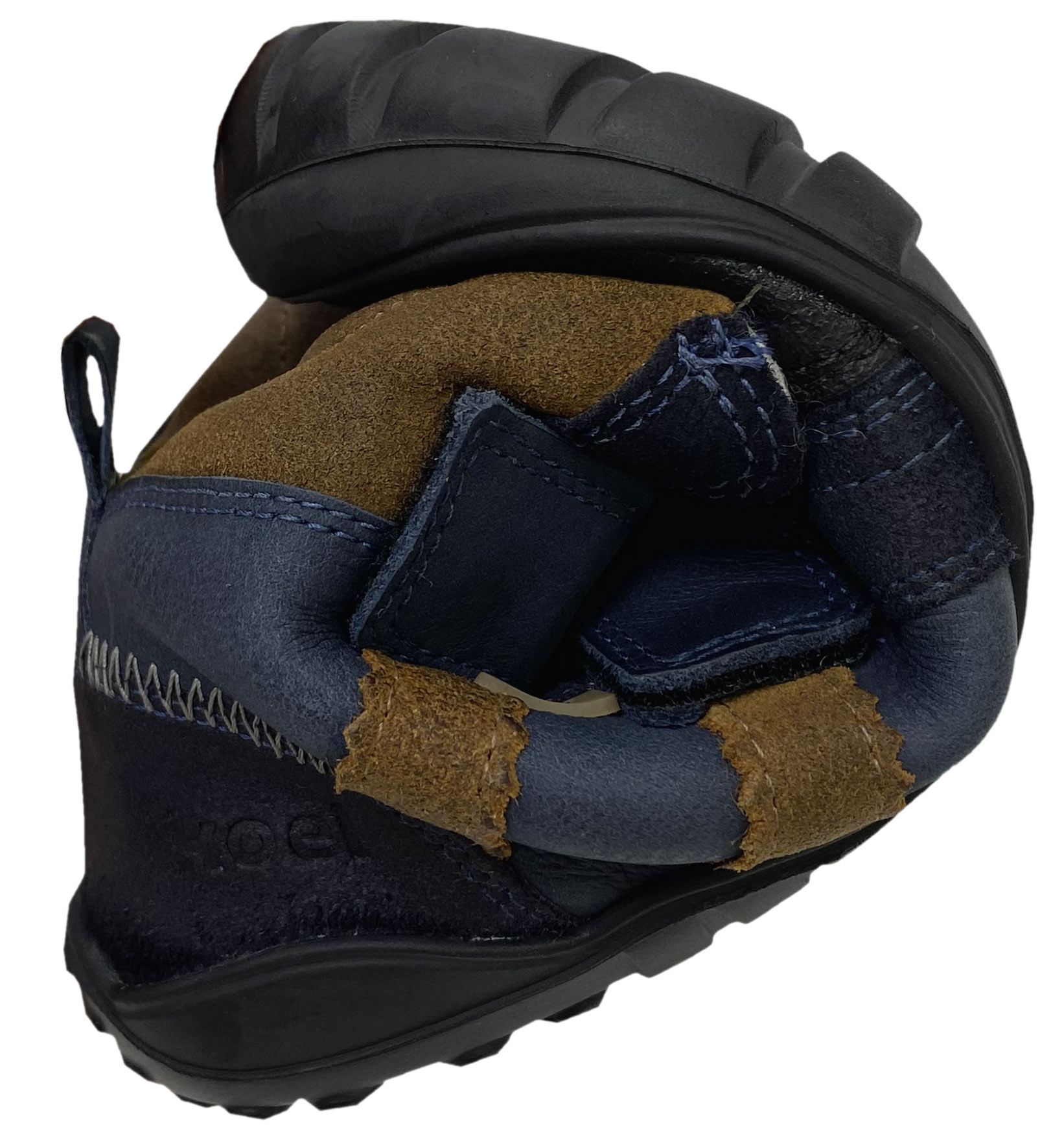 - an der Spitze mit hochgezogener Laufsohle gearbeitet, mit einem groben Besatz als zusätzlichen Schutz versehen