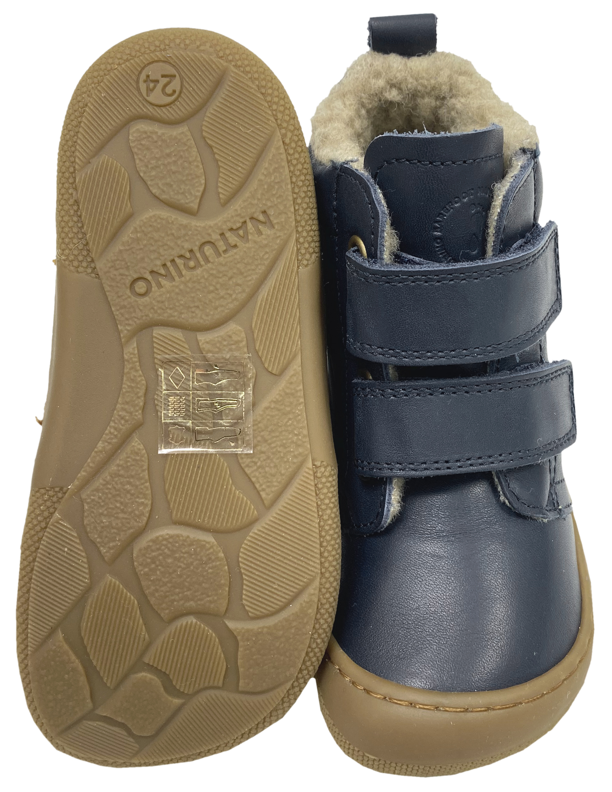 Super leichte, sehr flexible Minimalschuhe / Winterstiefel mit ganz softer, quer und längs flexibler Gummisohle aus gebürstetem Nappaleder, leicht zu öffnendem Doppelklett und kuschelig weichem Schurwollfutter innen von NATURINO aus der Barefootlinie.