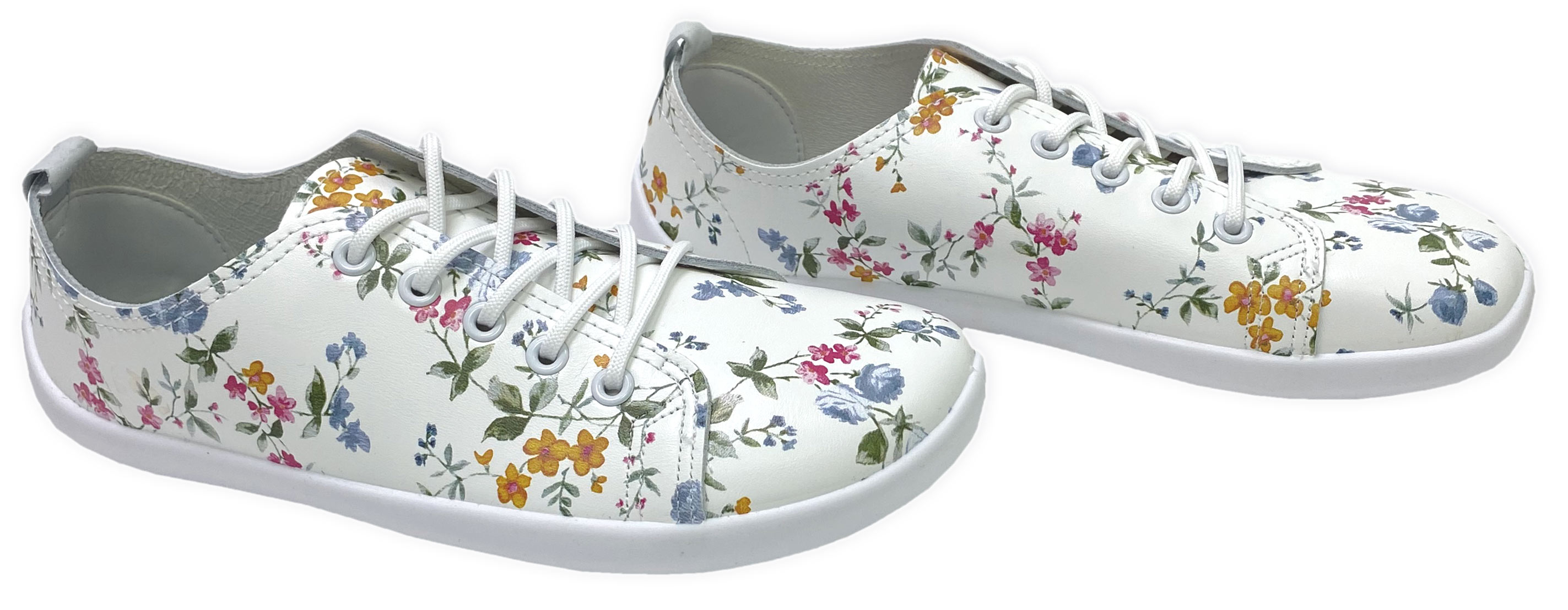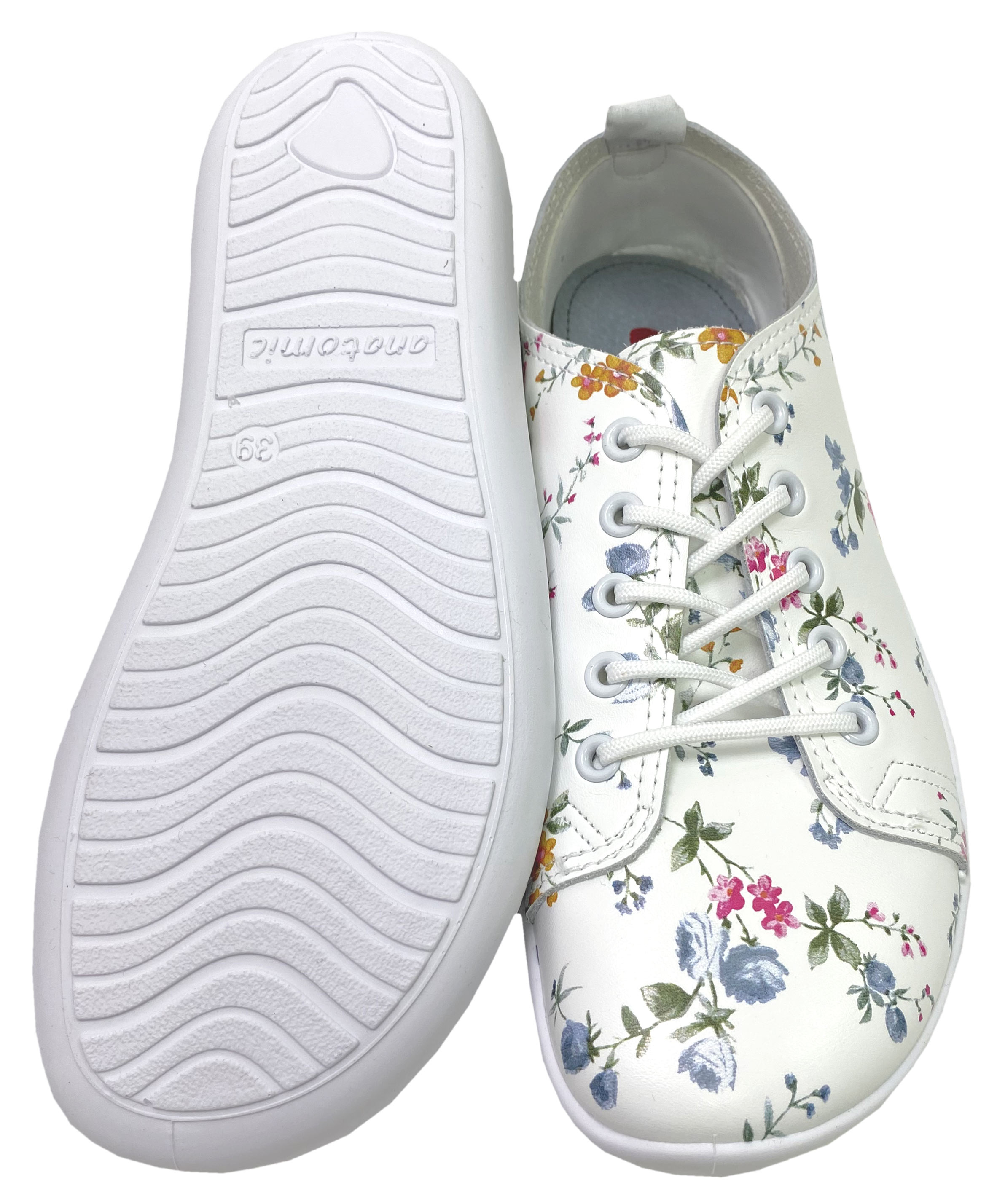 Klassische Halbschuhe in weiß mit buntem Blumen Muster Allover, seitlich kleiner Logostanzung, aus weichem Glattleder, in der mittleren Leiste auf einer quer und längs flexiblen 5 mm PU Sohle, Barfußschuhe für den Alltag von dem Tschechischem Hersteller ANATOMIC.