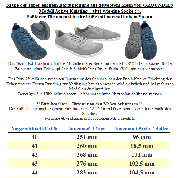 Sportlich schicke Barfußschuhe aus luftig leichtem und dehnbarem Mesh Gewebe - ein Gefühl als hätten sie nur Socken an, mit breiter - anatomischer Zehenbox, super flexibler TrueSense Active Sohle®, komplett neutralem Fußbett ohne jegliche Erhöhungen von GROUNDIES. !!Bitte beachten sie die Maße der Schuhe / als Bild hinterlegt, um so ein unnötiges hin und her senden zu vermeiden - bei Fragen mailen Sie uns einfach vor dem Kauf an - Ihr Team KJ Fashion !! Modell: Active Knit in Hellgrün / Wollweiß mit Ocean Petrol abgesetztMaterial: Polyester, davon 20% Recycelt | Innen: OnSteam® 90% PA Microfaser + 10 PU | Original TrueSense Active Sohle® mit 2 mm Basis und 2,5 mm Profil Weite (diese bezieht sich auf das Volumen im Schuh) M - also für normal hohen bis höheren Spann geeignet (flexibles Material) | Leisten (Stehfläche Fuß) normal | Mittelfuß: Normal / Mittel | Ferse: normal | Zehenbox: anatomisch gerundet geformt - richtig leichte und luftige Sneaker für den Alltag oder auch optimal zum Sport aus anschmiegsamem Mesh Gewebe - mit Ton in Ton gehaltenen Rundsenkeln zu schließen und optimal an den Fuß anzupassen - innen mit angenehm zu tragendem OnSteam Futter ausgelegt für ein gutes Fußklima - Innensohle austauschbar mit etwas Dämpfung oder ohne Dämpfung - Fersenbereich leicht abgepolstert für ein angenehmes Tragegefühl - mit einer bequemen Paßform für absolute Freiheit für normal breite Füße, ein Gefühl als würden Sie nur Socken tragen - auf der flexiblen und mega leichten TrueSense Active Sohle für ein absolut angenehmes Barfußgefühl mit ausreichend Grip Ein sportlich schicker Sneaker / Minimalschuh von GROUNDIES.