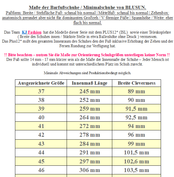 Lässiger Sneaker aus weichem Leder, mit super angenehm zu tragendem Futter ausgelegt, mit extrem flexibler und leichter TPU Sohle welche in Deutschland produziert wird, breiten wertigen Senkeln welche duch derbe metallene Ösen leicht zum händeln sind - stylische Barfußschuhe für große Füße von BLUSUN. !!Bitte beachten sie die als Bild hinterlegte Tabelle mit den Maßen um so ein unnötiges hin und her senden zu vermeiden - bei Fragen mailen Sie uns einfach vor dem Kauf an - Ihr Team KJ Fashion !! Modell: BLSN-200 M + W in Mittel bis HellgrauMaterial: Glattleder & Veloursleder Rindleder Gerberei Zertifikate: LWG Gold, ICEC, Blue Angel, LN | Innen: 100% Bio Baumwolle & Microline Kunstleder, Atmungsaktiv & Schadstofffrei | Innensohle: Microfaser, Atmungsaktiv, Antibakteriell, Schadstofffrei | Sohle: TPU Made in Germany, 4 mm Stärke + 1 mm Profil, Non MarkingWeite (diese bezieht sich auf das Volumen im Schuh) M - S für normal hohen bis flacheren Spann geeignet | Leisten (Stehfläche Fuß / Paßform ) normal bis minimal schmaler | Mittelfuß: normal | Ferse: normal | Zehenbox: gerundet, nicht für sehr dominanten Großzeh geeignet - sportlich schlichte Sneaker aus Glatt und Veloursleder, mit dekorativen Zier und Steppnähten, dezenten Logo Pressungen und Prints - mit Ton in Ton gehaltenen Flachsenkeln optimal an den Fuß anzupassen - weicher gepolsterter Zunge mit weichem Abschluß und gestanztem Logo mittig - innen mit angenehm zu tragendem Mikrofaser ausgelegt für ein gutes Fußklima, Innensohle fest vernäht um ein verrutschen zu vermeiden - Fersenbereich gut abgepolstert für ein angenehmes Tragegefühl und guten Halt an der Ferse, keine harte Fersenkappe - mit der anatomisch geformten Zehenbox für ein tolles, Barfußähnliches Laufgefühl und eine optimale Bodenfühligkeit durch die geringe Materialstärke von 4 mm Ein sportlich schicker Sneaker für größere Füße von BLUSUN.