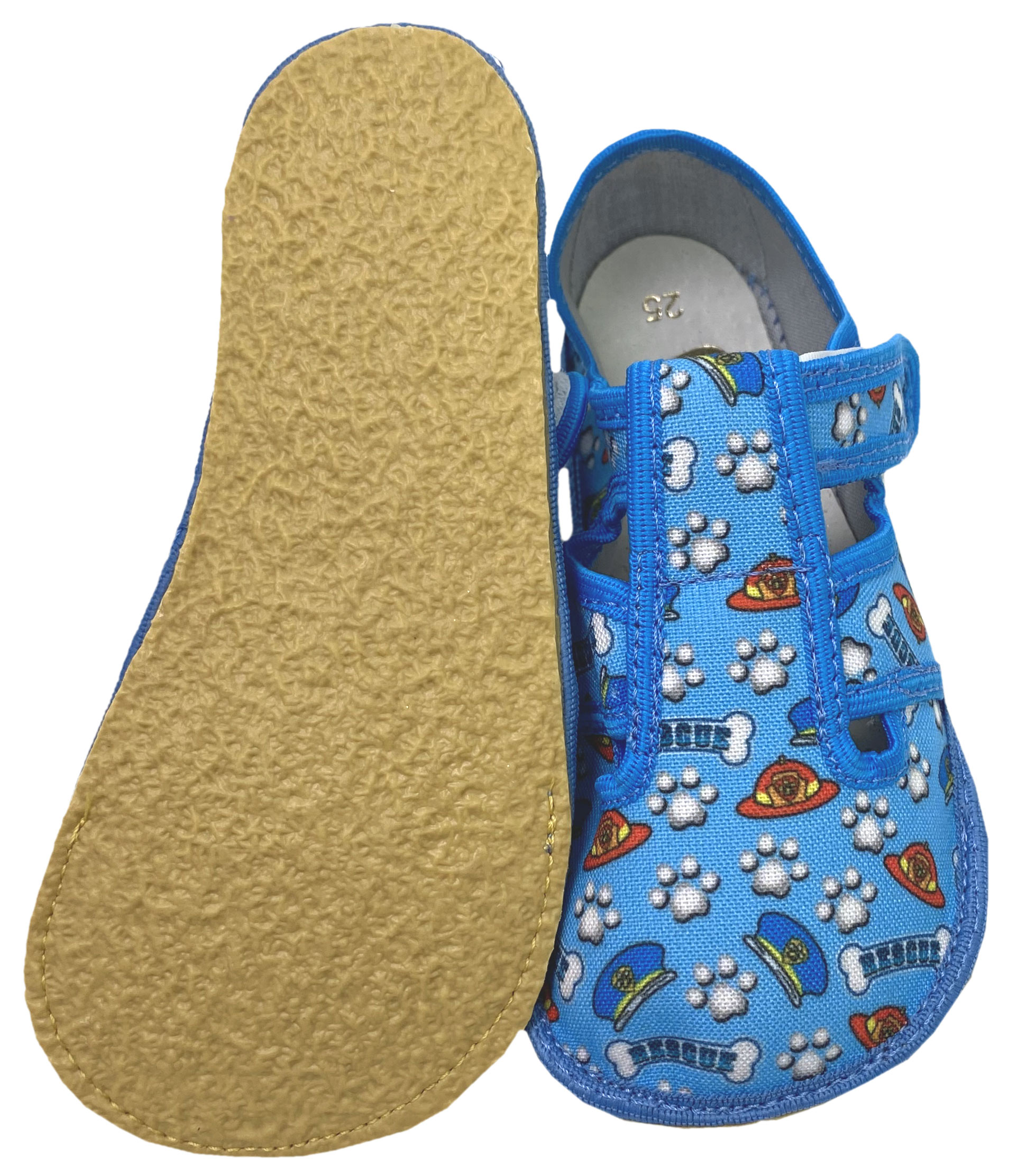 Sportlich schicke Hausschuhe aus dicht gewebtem Baumwoll Canvas, mit einem breiten Klettstreifen, mit einer 3 mm starken Kreppsohle gearbeitet welche gut quer und längs flexibel ist, aber dennoch robust ist, für aktive Kids von dem Tschechischem Hersteller ANATOMIC.