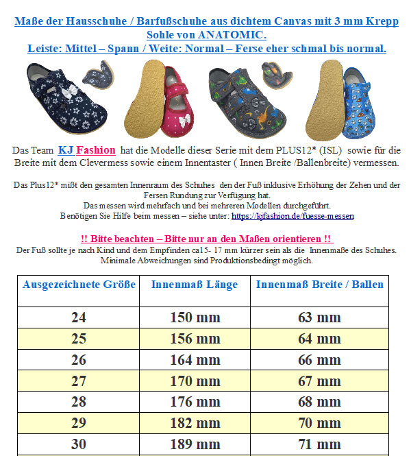 Sportlich schicke Hausschuhe aus dicht gewebtem Baumwoll Canvas, mit einem breiten Klettstreifen, mit einer 3 mm starken Kreppsohle gearbeitet welche gut quer und längs flexibel ist, aber dennoch robust ist, für aktive Kids von dem Tschechischem Hersteller ANATOMIC. !!Bitte beachten Sie das Bild mit den Maßen sowie unsere Paßformtips, um unnötiges hin und her senden zu vermeiden - bei Fragen mailen Sie uns einfach vor dem Kauf an - Ihr Team KJ Fashion !! Modell: DINO auf dunklem GrauMaterial: Baumwoll Canvas, Krepp Sohle mit 3mm Stärke, Innensohle mit dünnem Leder bezogen, herausnehmbarWeite (diese bezieht sich auf das Volumen / Spannhöhe) M für normal hohen Spann geeignet | Leiste (Stehfläche Fuß) Mittel | Mittelfuß: Normal | Ferse: eher Schmal bis normal | Zehenbox: anatomische Form - bequeme Hausschuhe aus dicht gewebtem Baumwoll Canvas - an der Ferse etwas höher gezogen um diese komplett zu umfassen und ein herausrutschen zu vermeiden - breiter Klettstreifen um einen guten Halt zu geben, auch über dem MIttelfuß mit einem breiten Streifen gearbeitet - der Spann hat gut Platz da der Canvas nicht zu schnell zur Spitze hin flach verläuft - Zehenbox gerundet für einen guten Platz auch für die Großzehe - innen mit dem dicht gewebtem Canvas gearbeitet - eine mit dünnem Leder bezogene Innensohle zum herausnehmen - die Krepp Sohle ist quer und längs flexibel, weicht sich durch das tragen noch um einiges nach !! Bitte beachten - für extreme Nutzung durch Bobby Car / Laufrad etc bitte geeeignete Schutzkappen über die Schuhe ziehen - da diese dafür nicht ausgelegt sind !!