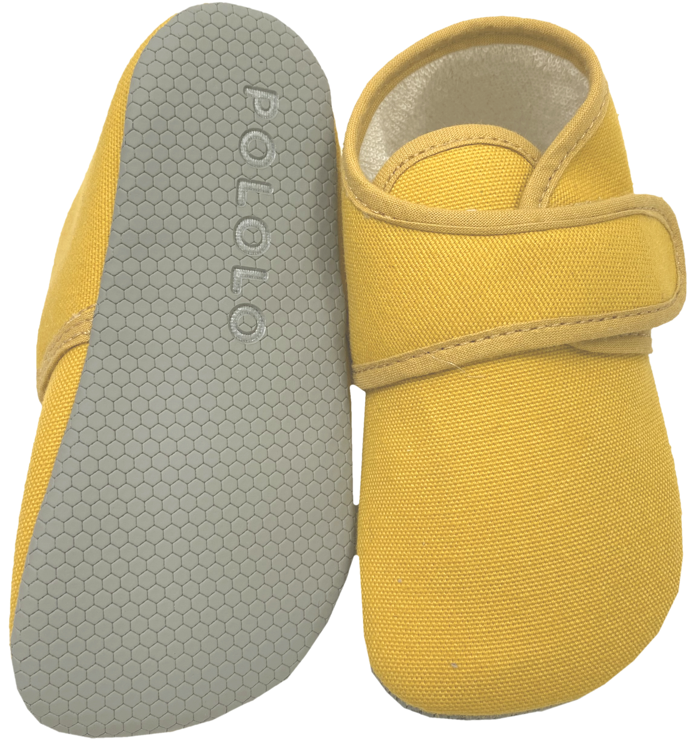 Produktinformationen "Knautschige Barfußhausschuhe mit Klett BIO BW + Anti Rutsch Sohle *Gelb Uni* von POLOLO"