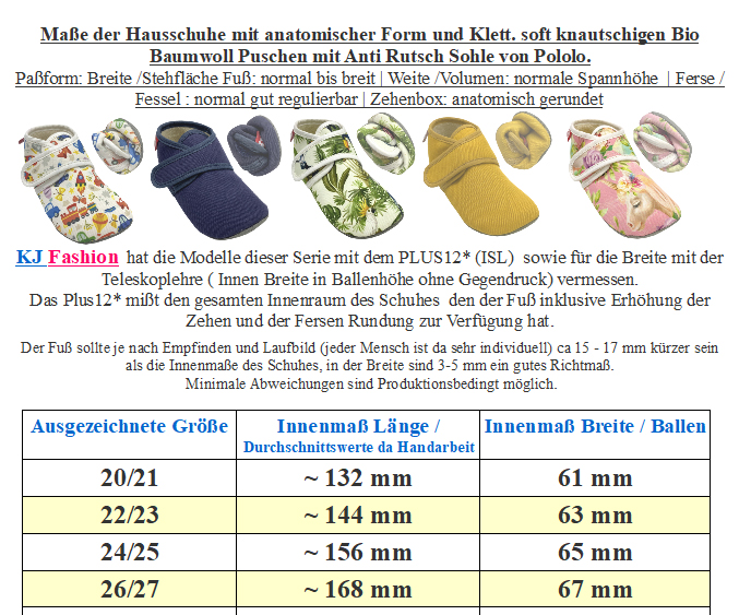 Dieser vegane Barfuß-Hausschuh aus weicher Bio Baumwolle von POLOLO bietet kleinen Kinderfüßen maximalen Komfort, Bewegungsfreiheit und einen optimalen Sitz am Fuß – perfekt für Zuhause oder die Kita. > Bitte beachten Sie die im Bild angegebenen Maße, um unnötige Rücksendungen zu vermeiden. Bei Fragen wenden Sie sich gerne vor dem Kauf per E-Mail an uns. Ihr Team KJ Fashion! < Modell: Pololo Cosy Uni BlauMaterial: 100 % Bio Baumwolle | Innen: 100% Bio Baumwolle | Laufsohle: synthetisches GummiWaschbar im Wollwaschgang bei 30 °C oder per Handwäsche (Innensohle vorher herausnehmen) Hinweis: Baumwolle kann sich beim Waschen leicht zusammenziehenWeite (diese bezieht sich auf das Volumen im Schuh) füür normal hohen Spann | Leisten (Stehfläche Fuß) normal bis etwas breiter | Ferse: normal | Zehenbox: anatomisch geformt - kindgerechte, super bequeme, weiche Hausschuhe / ersten Schuhe aus veganen Materialien - Ergonomisch breite Zehenbox für natürliches Gehen und ungehindertes abrollen - großzügiger Einstieg, mit breitem Klett zu schließen und so optimal an den Fuß anzupassen - Bio Baumwolle als Obermaterial und Innen ebenfalls aus weicher Bio Baumwolle in Frottee Qualität, super angenehm auf der Haut - Rutschhemmende, super flexible Sohle für optimalen Halt auch auf glatten Böden - Innensohle ist herausnehmbar, bitte diese vor dem waschen auch immer herausnehmen Ein idealer Hausschuh für Kinder, die die Bewegungsfreiheit lieben und ihre Füße schützen wollen, bequem, durchdacht und nachhaltig von POLOLO, hergestellt in Spanien. !! Bitte beachten - extreme Nutzung durch Bobby Car / Laufrad / stark schleifen über grobe Teppiche- führt zu erhöhtem Abrieb des Materials !!
