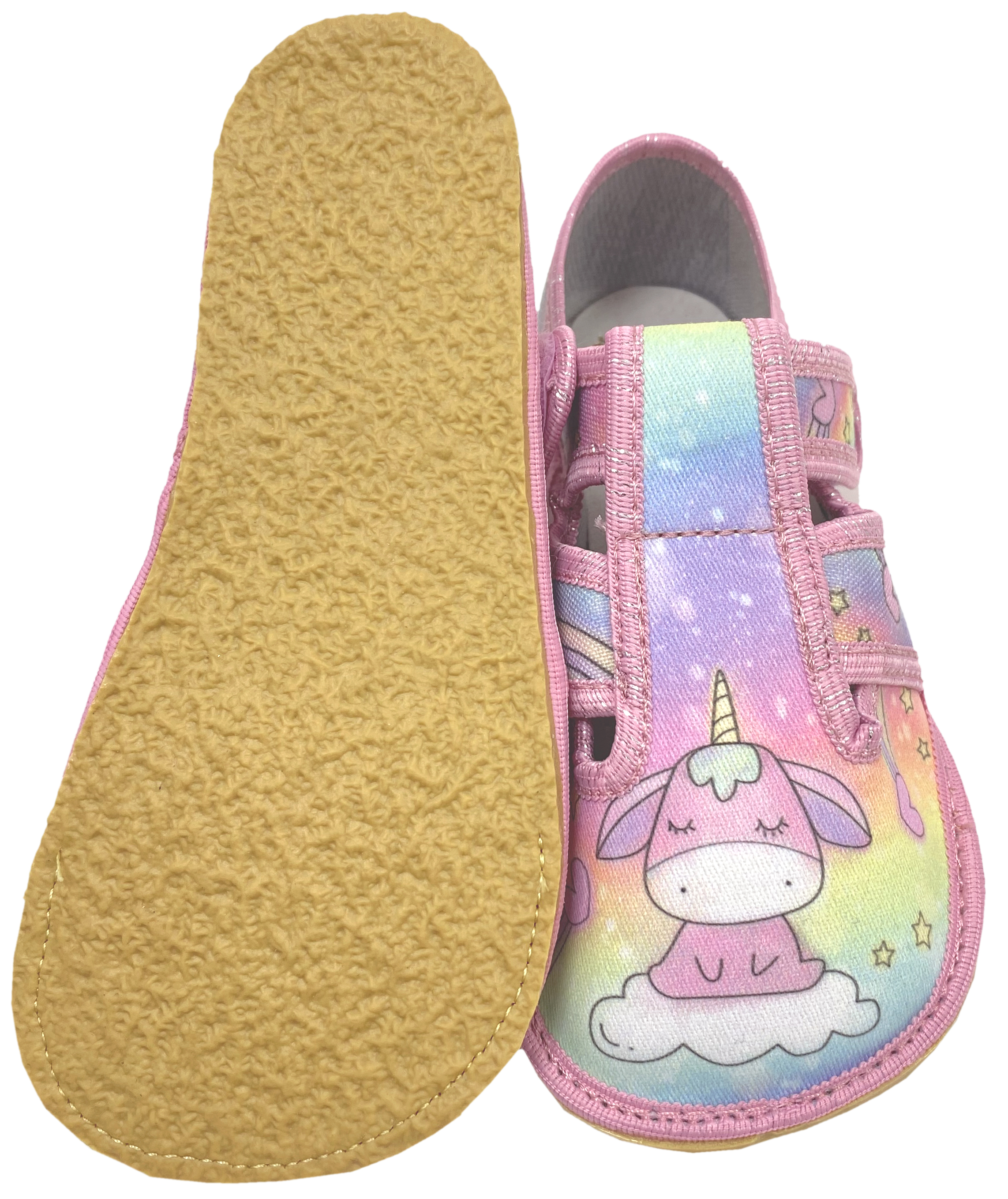Textil Slipper / Hausschuhe mit kindgerechten Motiven aus robustem Baumwoll Canvas, mit breitem Klettstreifen zu regulieren, einer 3 - 4 mm starken, gut quer und längs flexiblen Kreppsohle für Kids von dem Barfußschuh Label Crave.