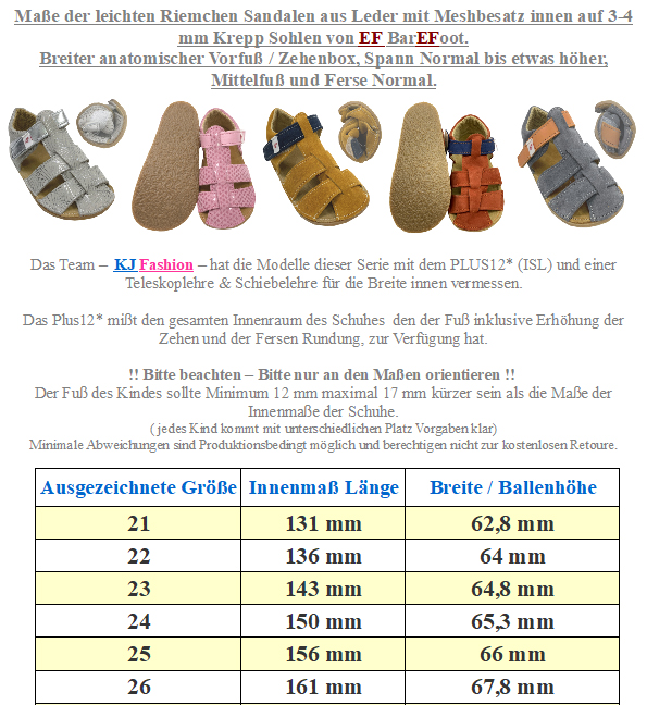 Leichte und absolut flexible Sandalen aus weichem Leder aus der Region des Herstellers, auf einer 3 - 4 mm Gummi Krepp Sohle, mit breitem Klettstreifen, optimal an die Fessel anzupassen, aus der Tschechischen Republik - ein junges, fortschritliches Unternehmen von Schuhen mit Minimalsohlen für jede Saison - Barfußschuhe mit soliden Preisen in hochwertiger, robuster Qualität - das ist EF BarEFoot. !! KJ FASHION Tip: Bitte dringend das Bild mit den genauen Maßen je Größe beachten !! Bei Fragen gerne Mail an uns :-) Modell: Rostorange / BlauMaterial: Nubukleder | Laufsohle: Gummi Krepp 3 - mm Stark - mit Leder bezogen, innen mit Mesh ausgelegtPaßform: Leisten (Standfläche Fuß - als Breite bezeichnet ) normale Breite | Weite ( beschreibt das Volumen auch als Spannhöhe bezeichnet) : normal bis etwas höher - für normalen bis minimal höheren Spann | Mittelfuß: normal | Ferse: normal | Zehenbox: Anatomisch geformt - leichte, sehr gut quer und längs flexible Sandale mit zwei Riemchen über dem Mittelfuß für guten Halt - ein breiter Streifen über dem Vorfuß um die Zehen zu schützen - Fersenbereich schön ausgearbeitet so das diese gut gehalten wird - mit einem breiten Klettstreifen an der Fessel zu regulieren, so hat die Sandale einen sehr guten Sitz am Fuß des Kindes - die Innensohle ist mit Leder bezogen - die weiche und sehr flexible Krepp Sohle schützt vor Verletzungen und heißem Boden hemmt aber die Bewegung nicht stark ein Ein super leichter und flexibler Barfußschuh von BABY BARE der optimal an warmen Tagen getragen werden kann und dem Fuß optimale Belüftung, aber auch Schutz gibt, aber auch prima als Hausschuh Ersatz zu nutzen falls er dann doch eher im Herbst / Winter paßt :-)