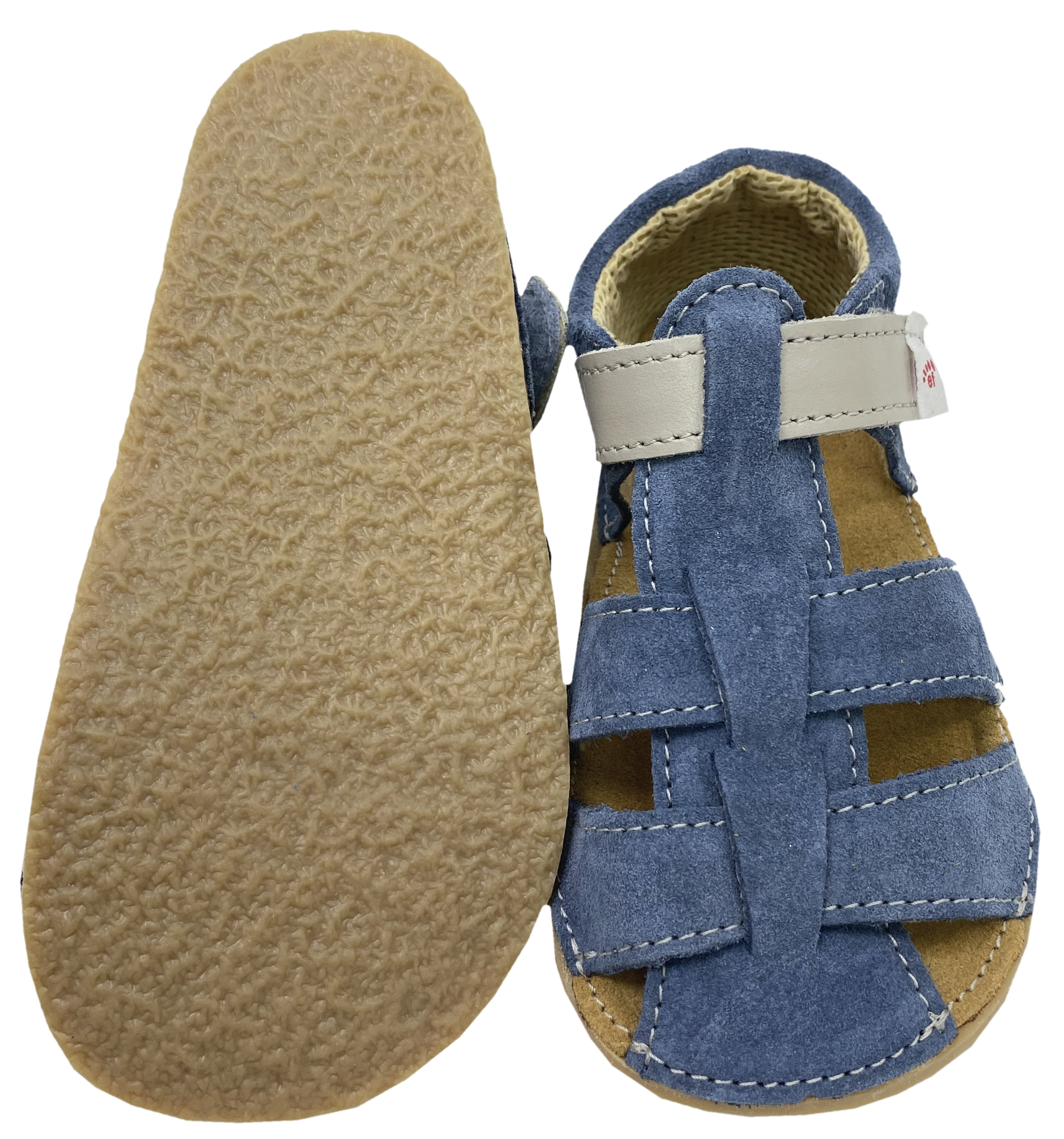 Leichte und absolut flexible Sandalen aus weichem Leder aus der Region des Herstellers, auf einer 3 - 4 mm Gummi Krepp Sohle, mit breitem Klettstreifen, optimal an die Fessel anzupassen, aus der Tschechischen Republik - ein junges, fortschritliches Unternehmen von Schuhen mit Minimalsohlen für jede Saison - Barfußschuhe mit soliden Preisen in hochwertiger, robuster Qualität - das ist EF BarEFoot.